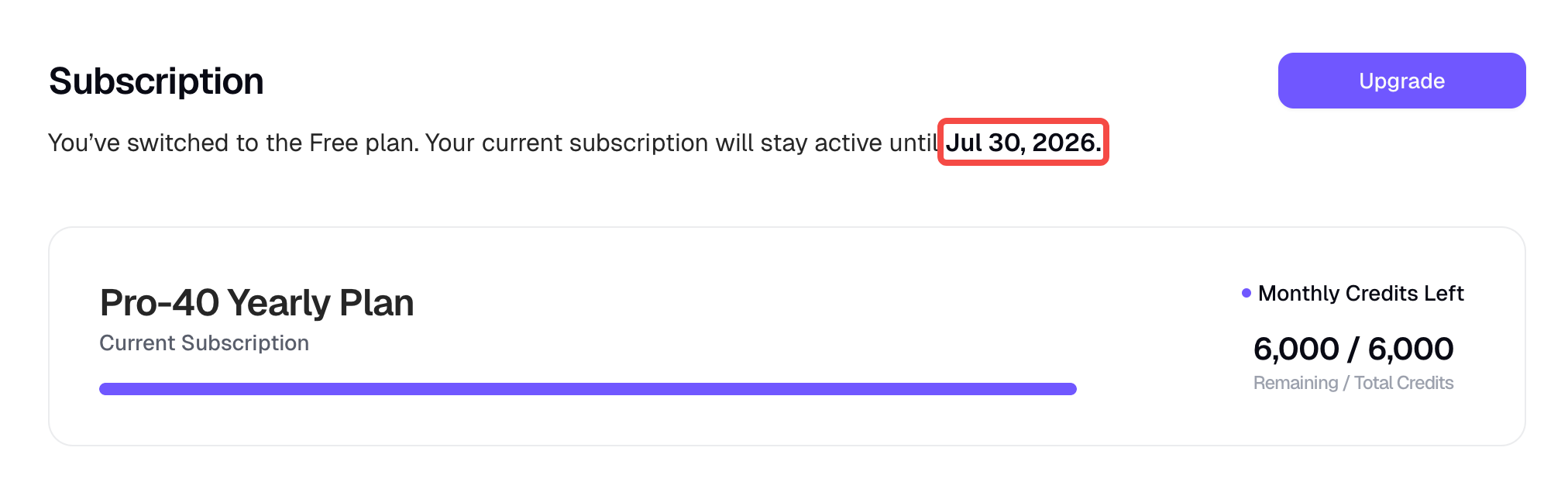 For example, if you subscribed on June 12, your subscription will end on July 12.You can also check your plan’s expiration date and see when it will switch to the Free plan on the Billing page.