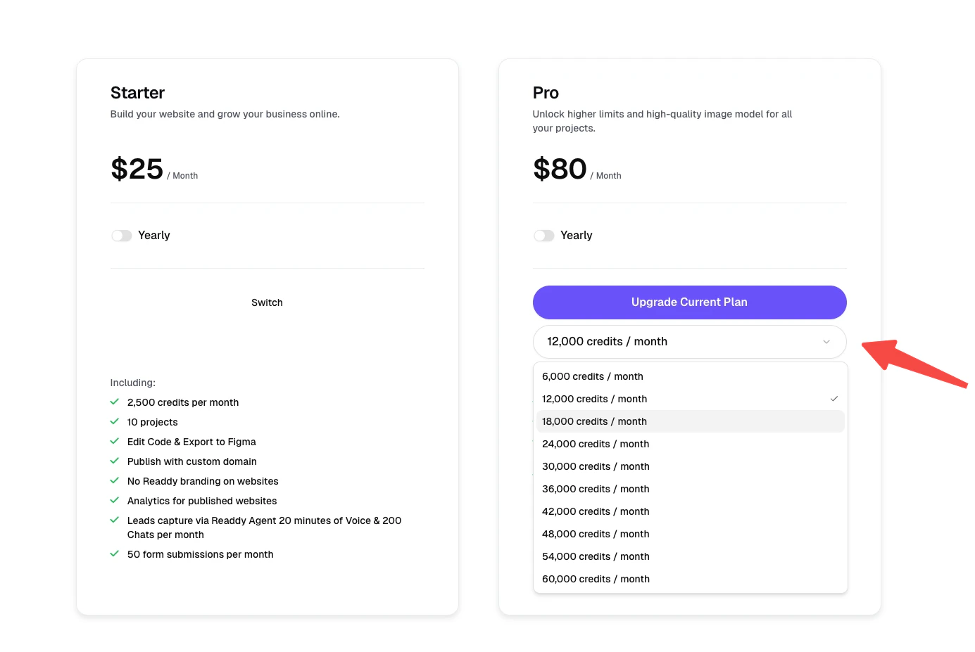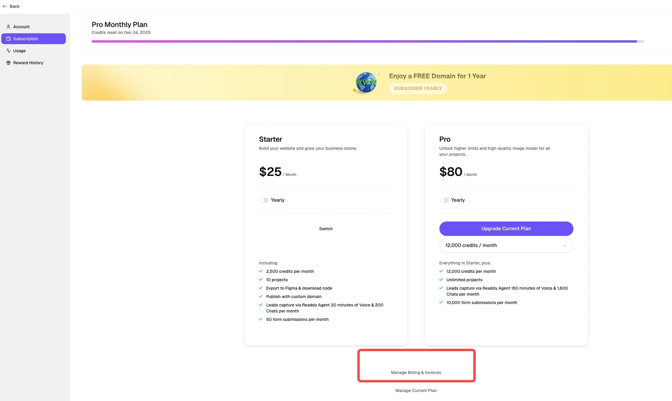 If you’re on our Starter Plan, you can upgrade to the Pro Plan for immediate access to more credits. If you’re already on the Pro Plan, you can still remain on your current plan. To continue, please go to the Subscription page and choose a plan that fits your needs — you’ll find all available options displayed as shown in the screenshot below.