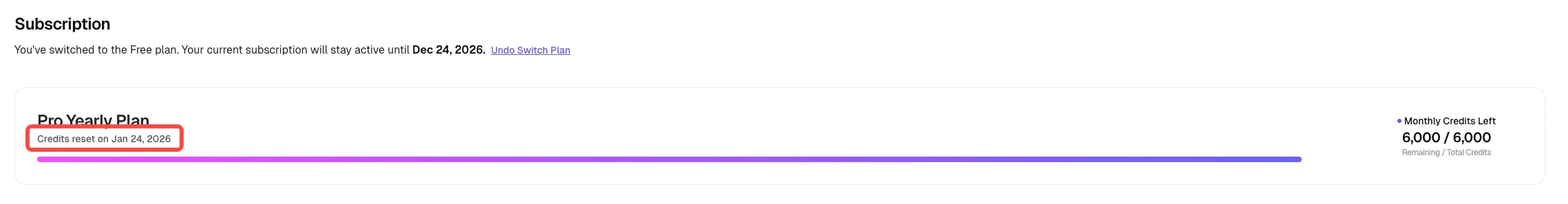 Credits reset automatically at the end of each billing cycle. The number of new credits will depend on your current subscription plan. You can check the reset time for your billing cycle here: