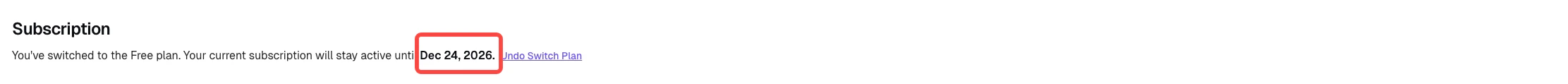 Your subscription ends at the end of the next billing cycle after the day you purchased the plan. For example, if you subscribed on June 12, your subscription will end on July 12.You can also check your plan’s expiration date and see when it will switch to the Free plan on the Billing page.