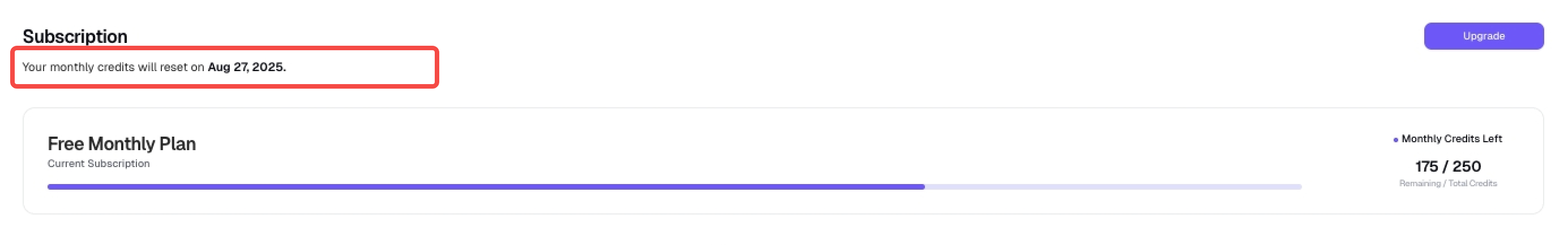 Credits reset automatically at the end of each billing cycle. The number of new credits will depend on your current subscription plan.