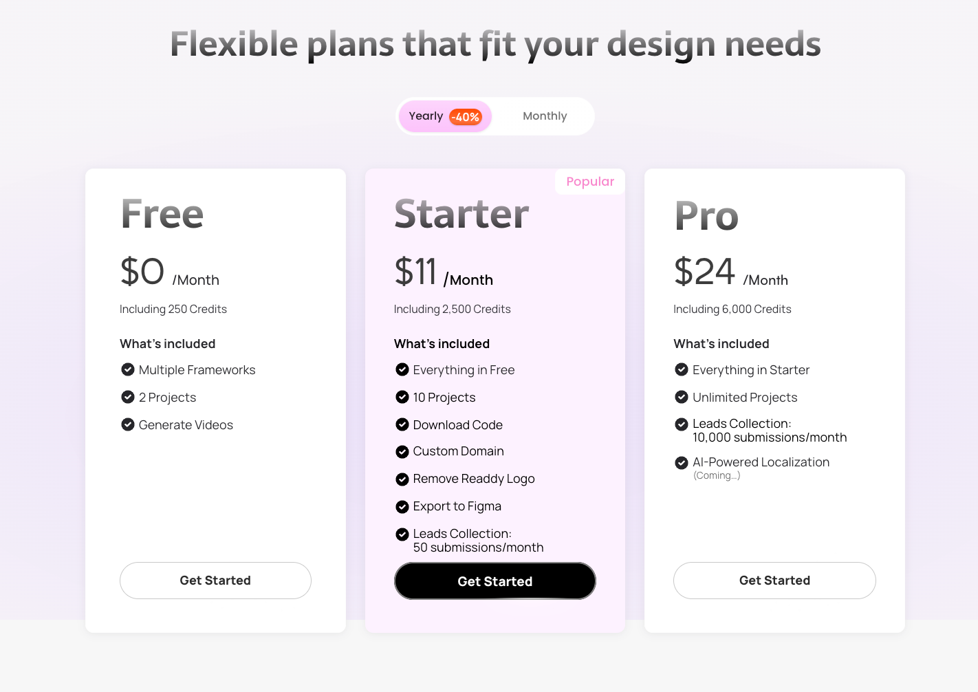 Readdy offers 3 plans designed to fit different design generation needs:Free Plan