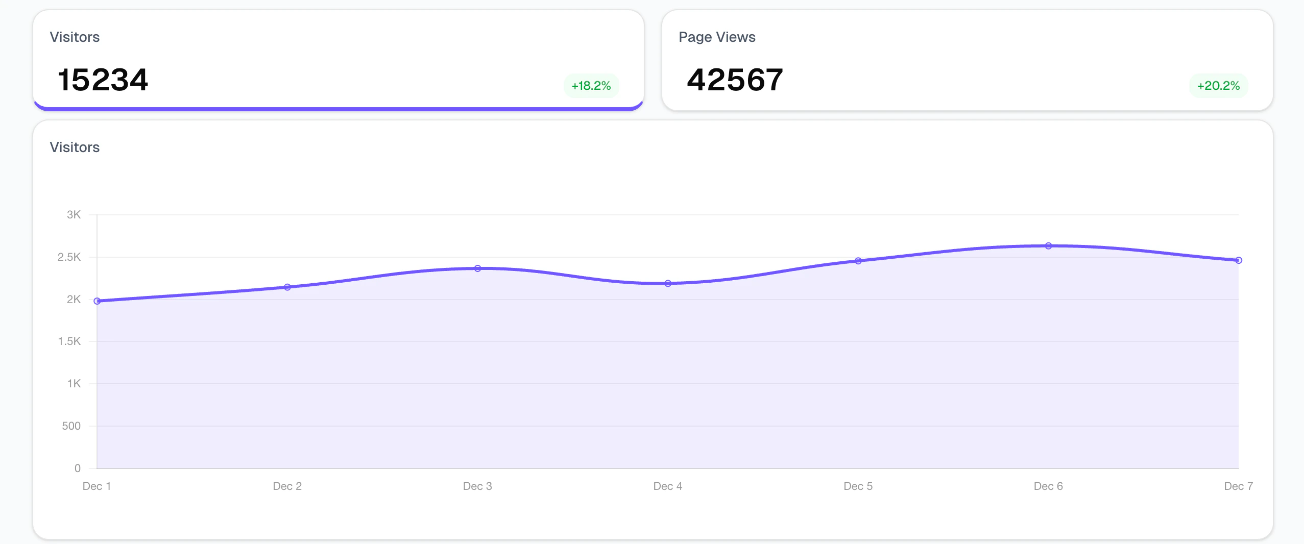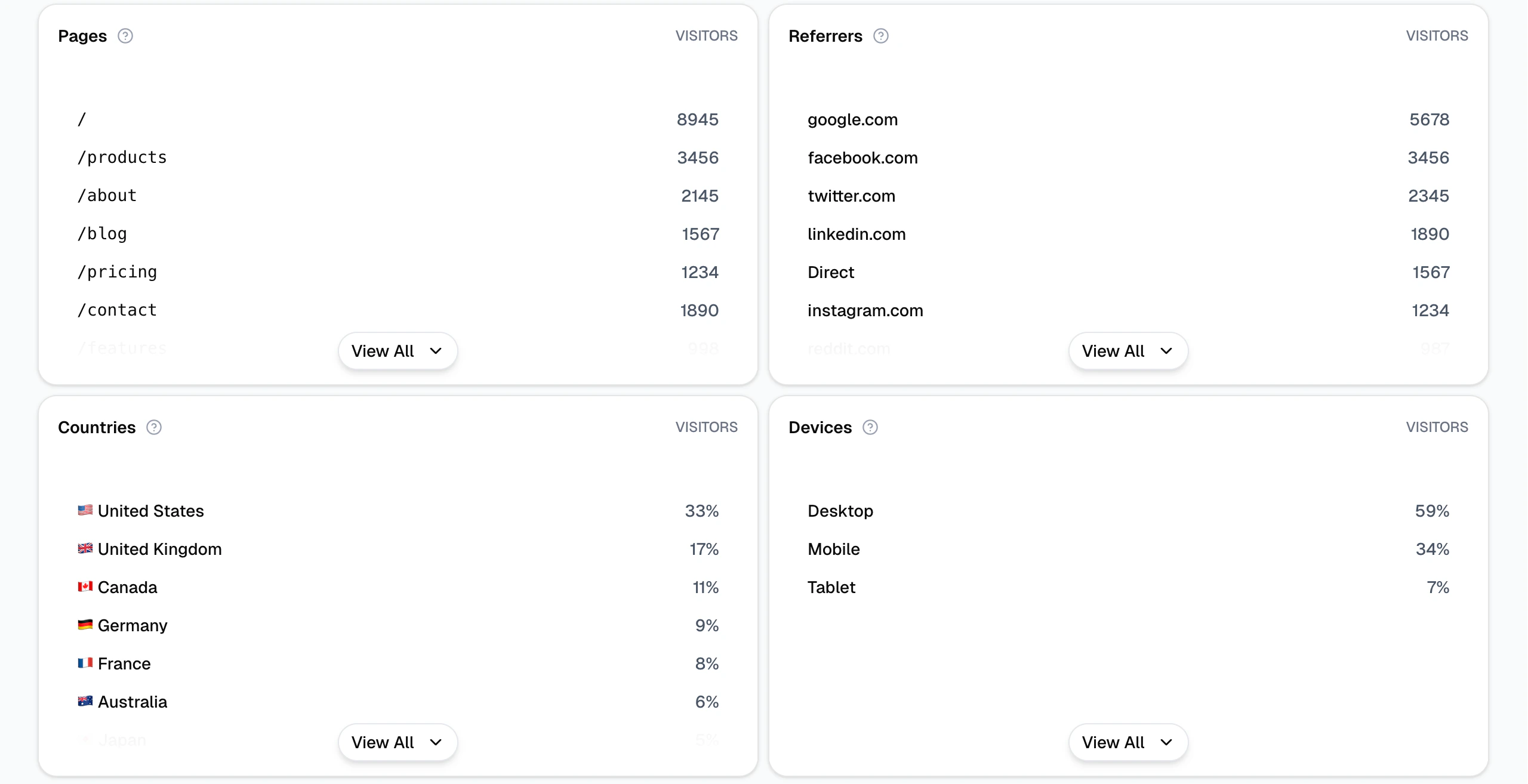 Panels provide a way to view detailed analytics for Visitors and Page Views, such as top pages and referrers. They also show additional information such as the country and device of your visitors, helping you better understand your audience.