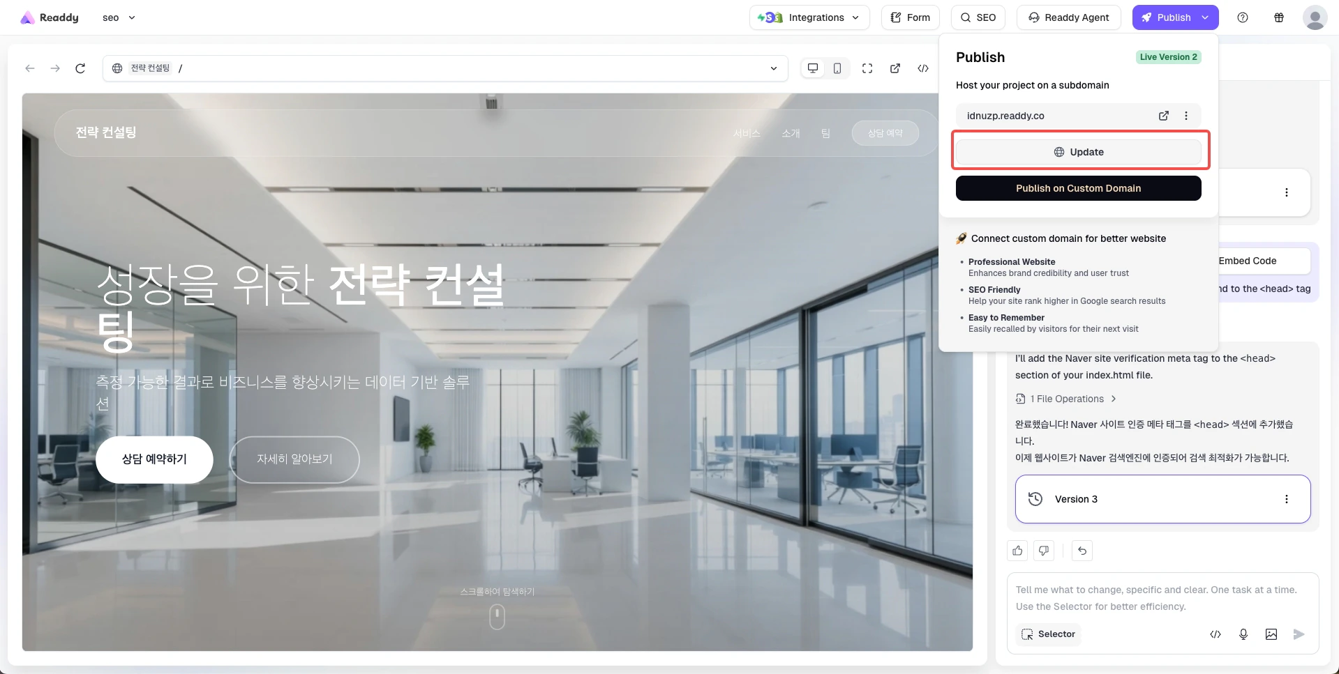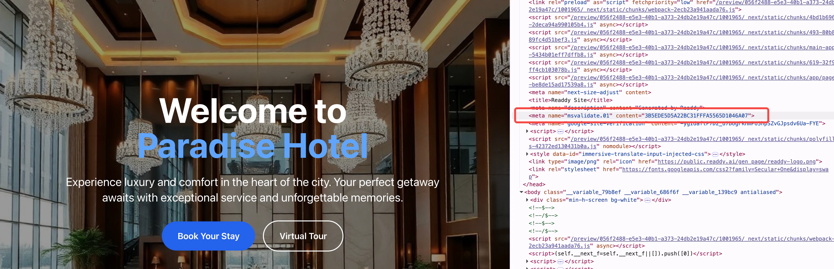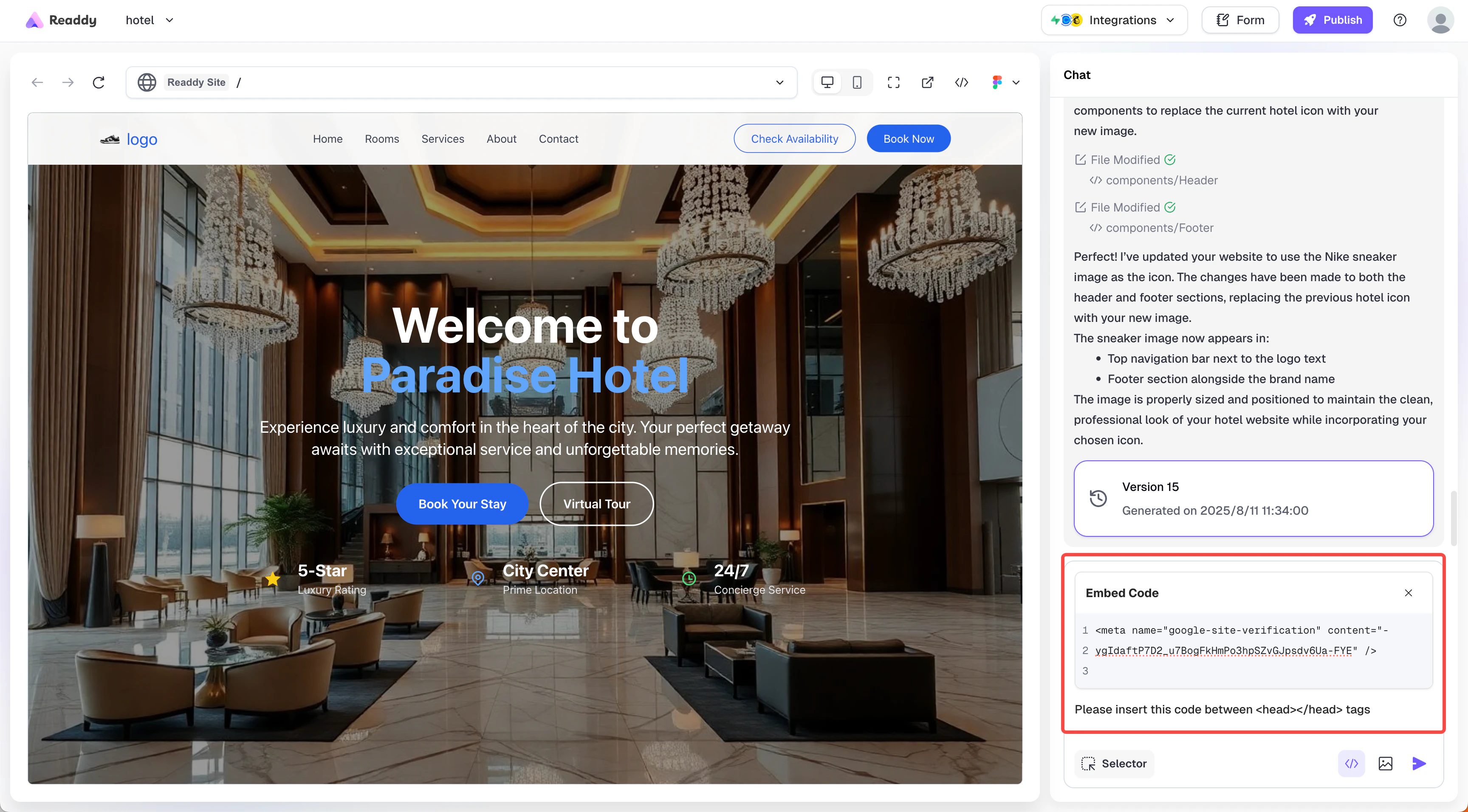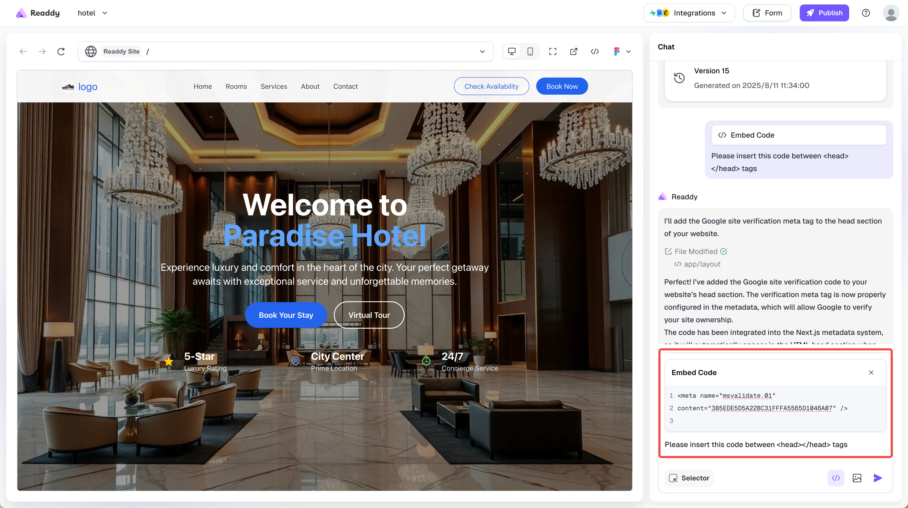 - Readdy generates a new version of your website containing the verification meta tag