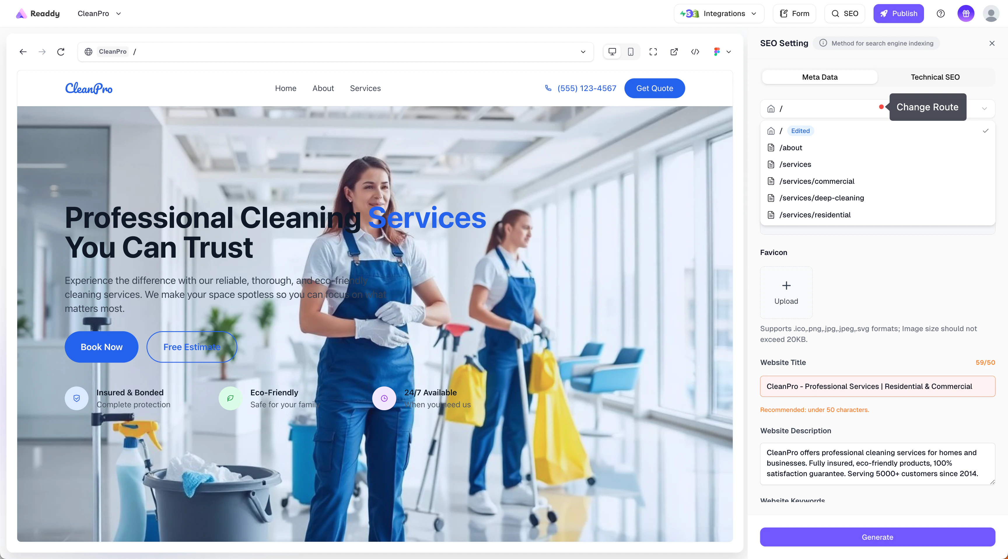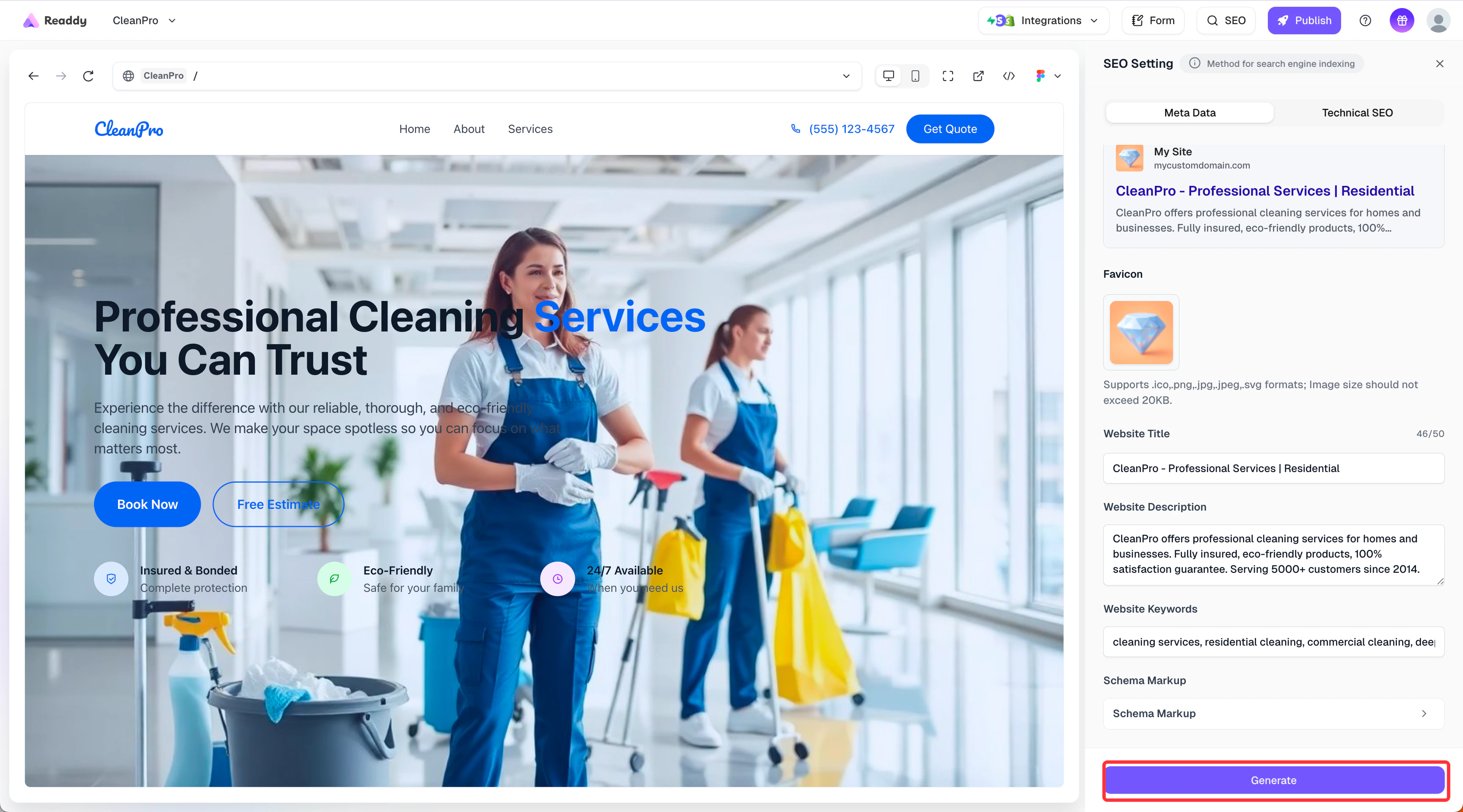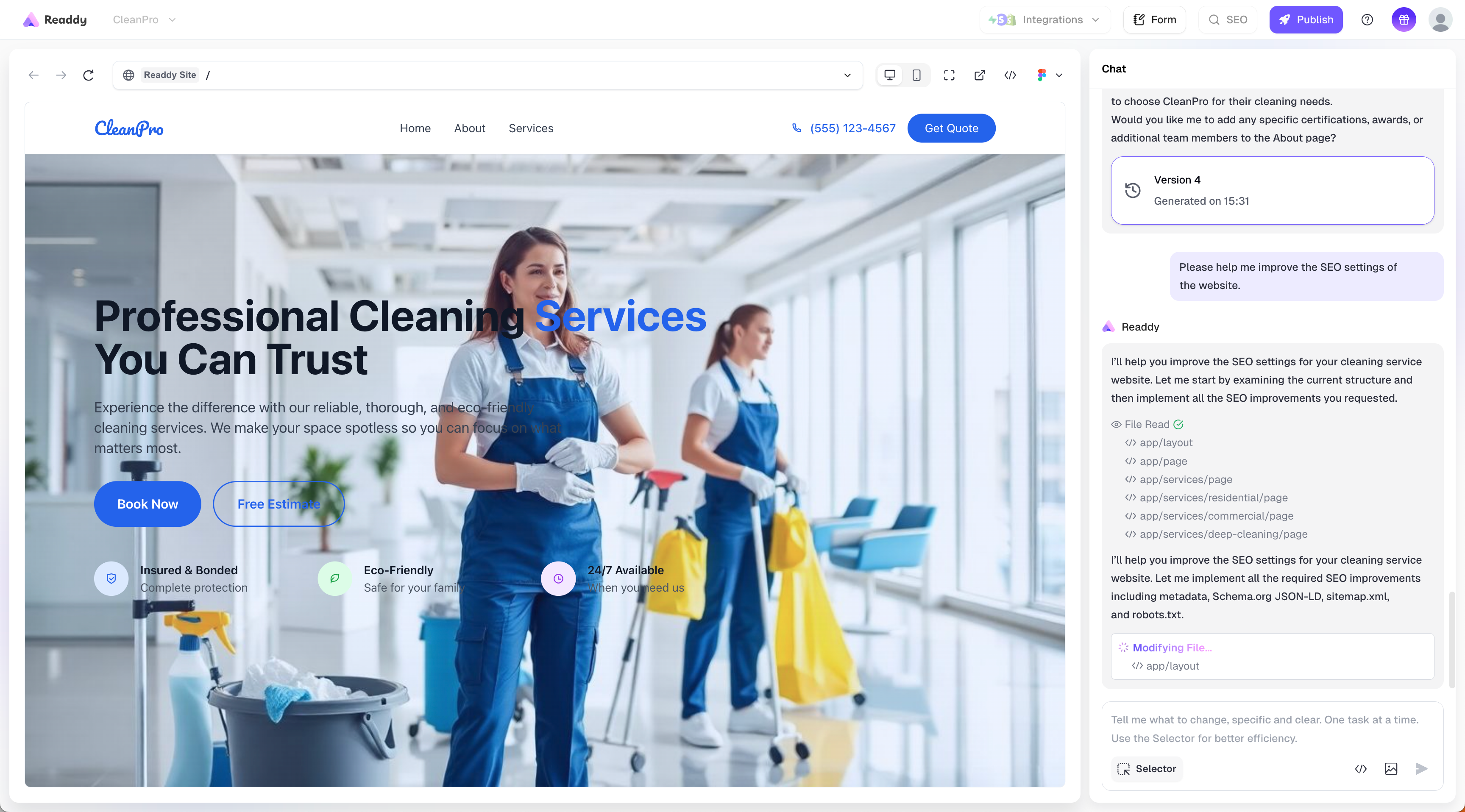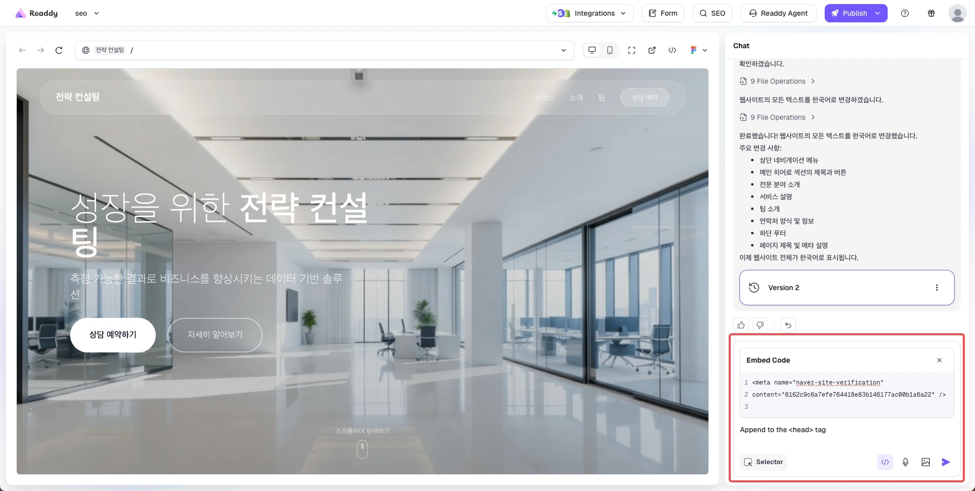 - Readdy generates a new version of your website containing the verification meta tag