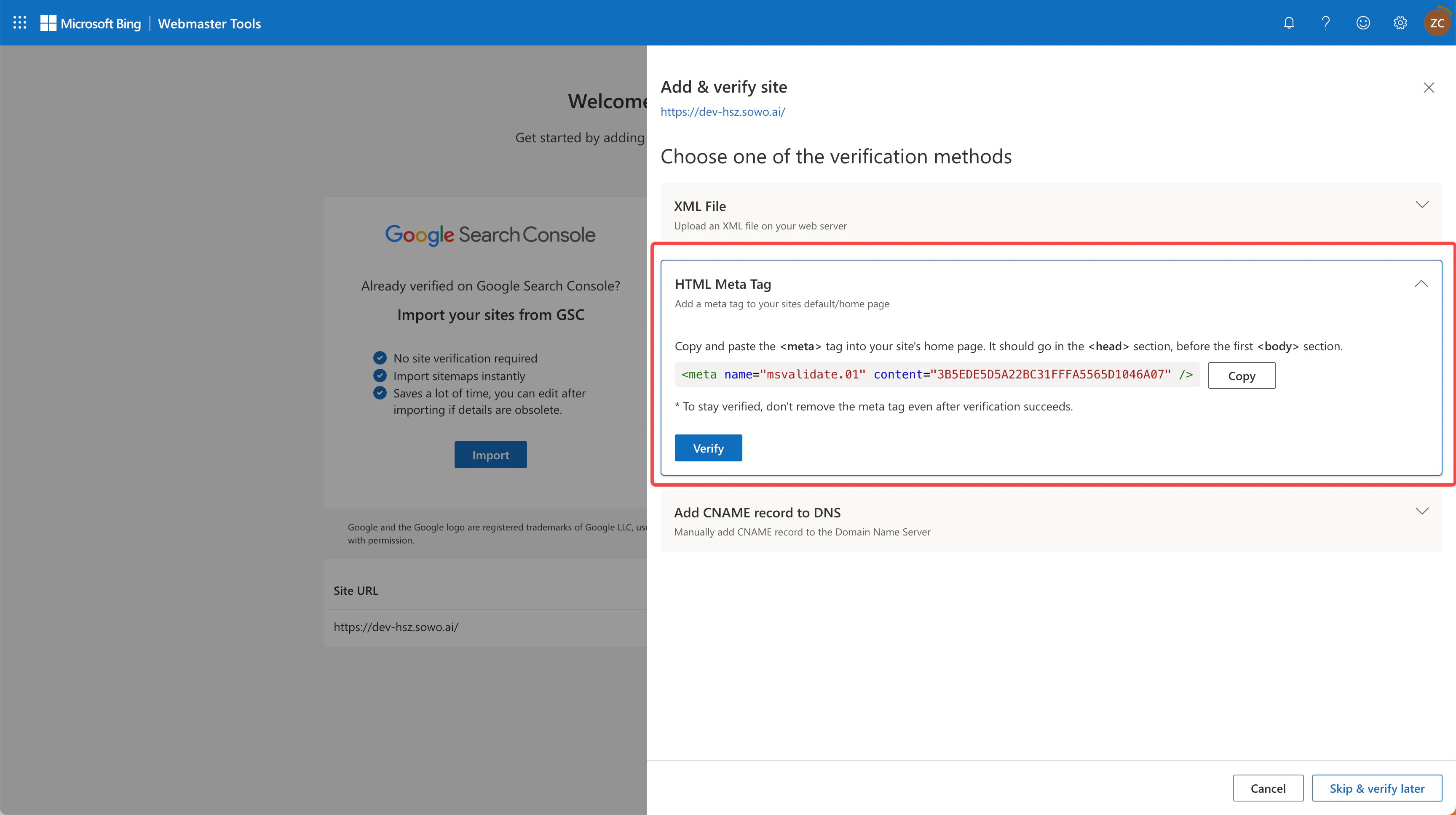 Bing offers multiple verification methods. We recommend selecting the “HTML Meta Tag” method for verification.