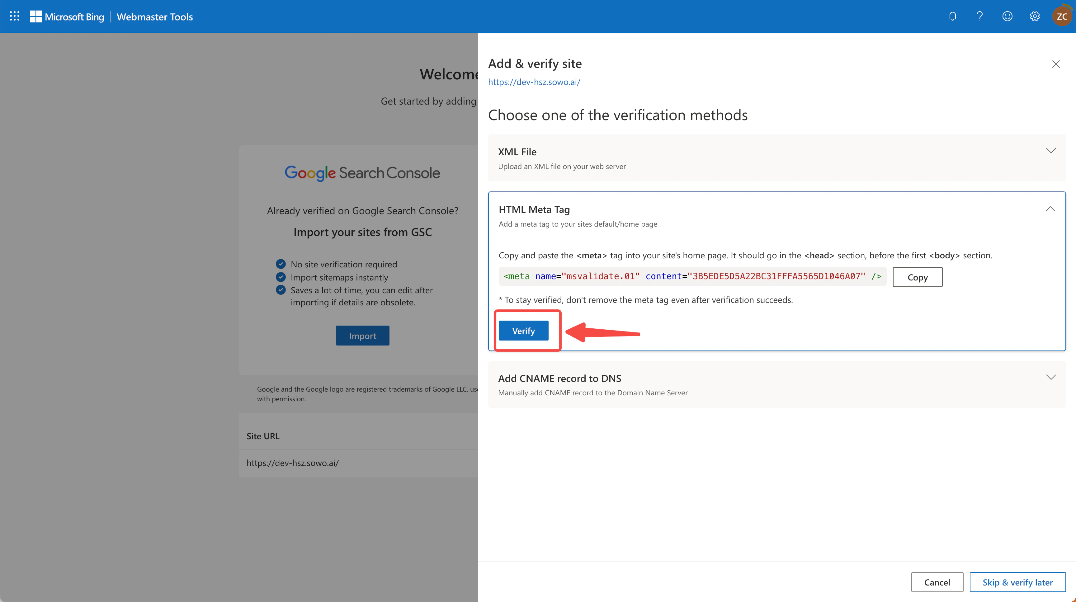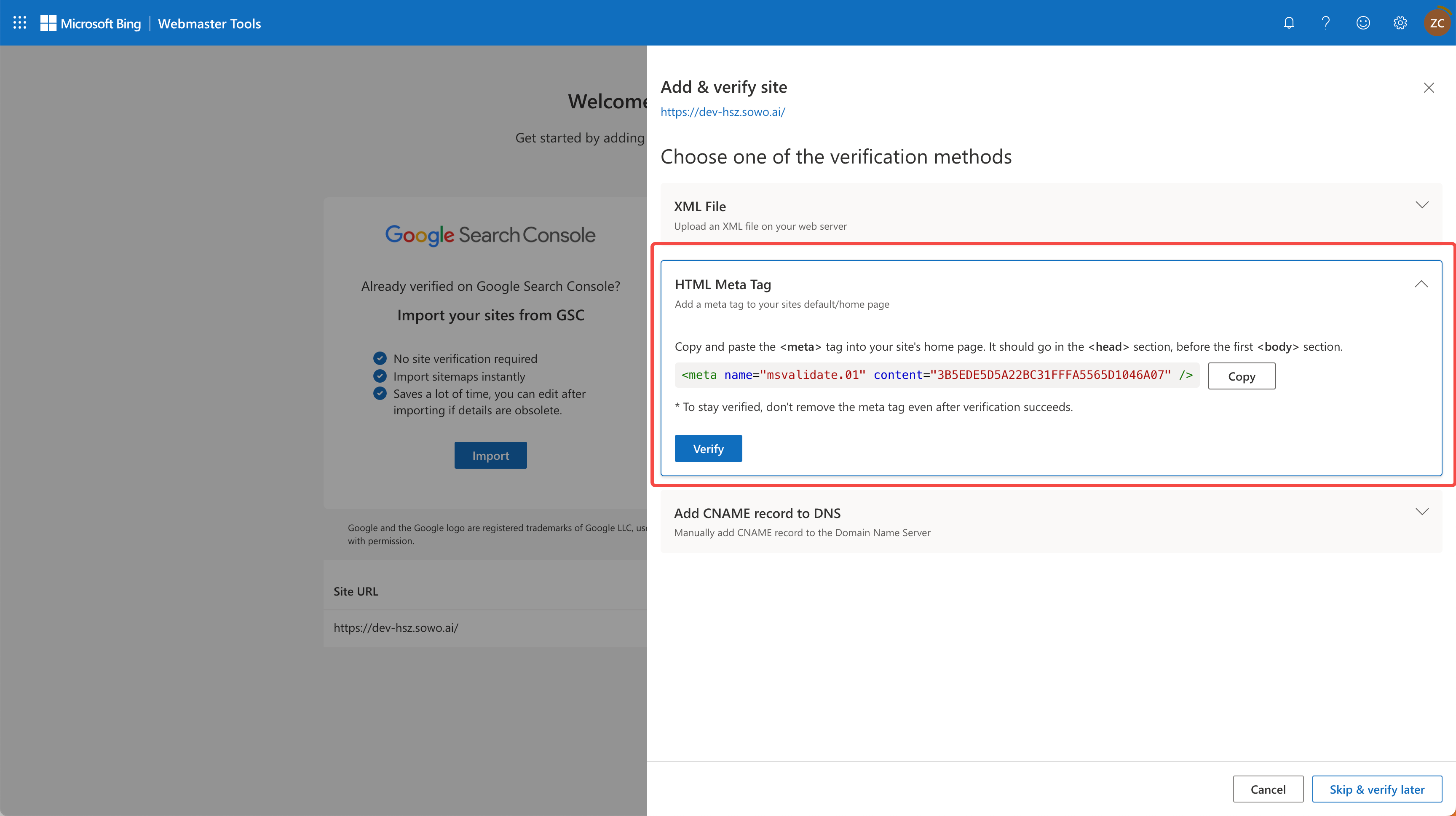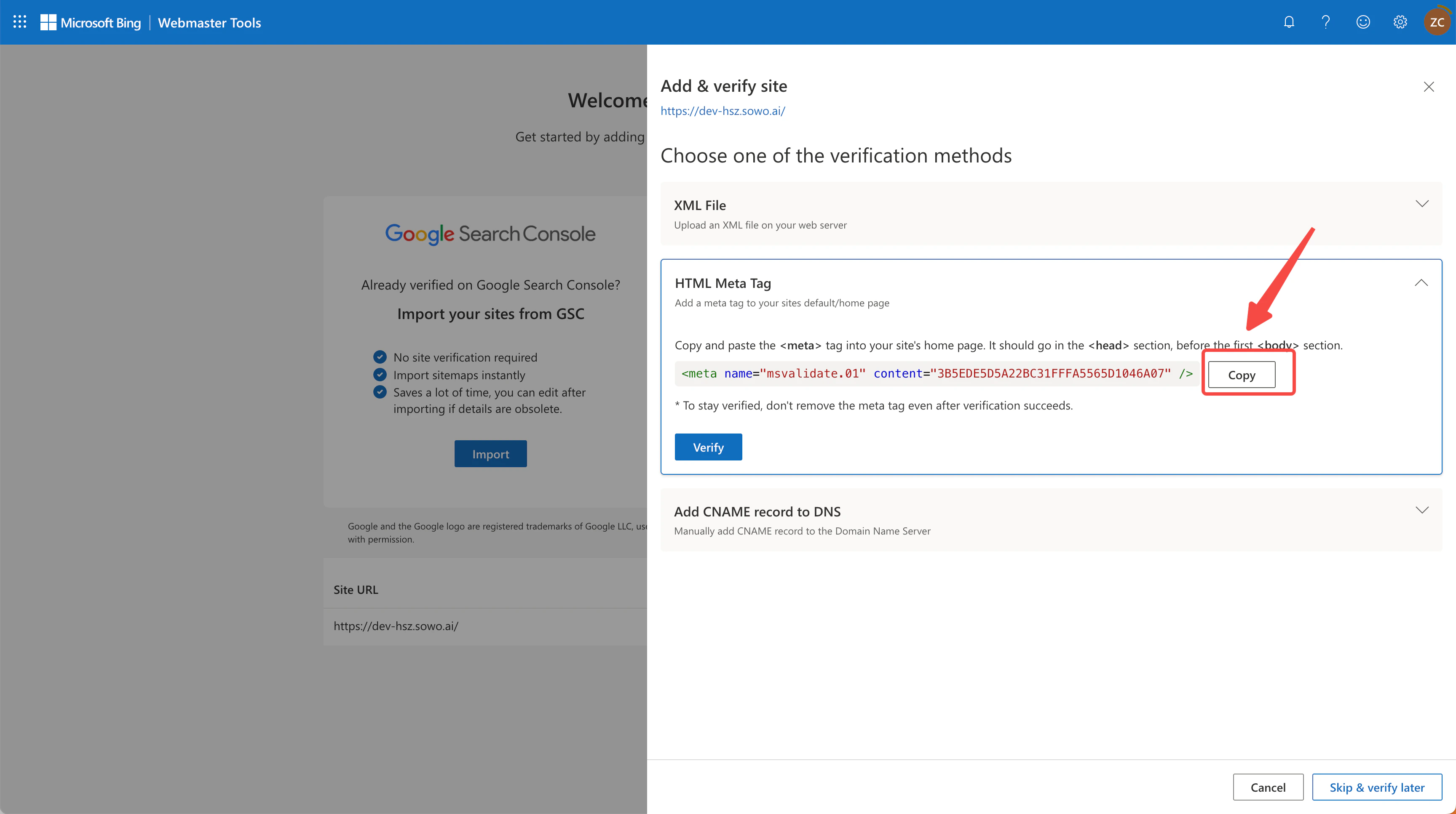 - Copy the meta tag code provided by Bing