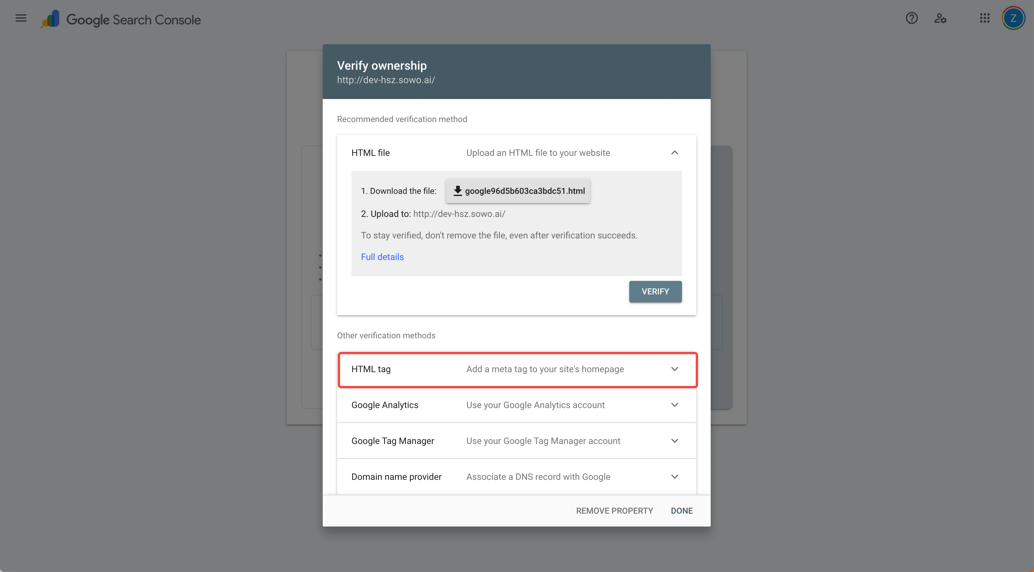 Select the HTML tag verification method to confirm website ownership.