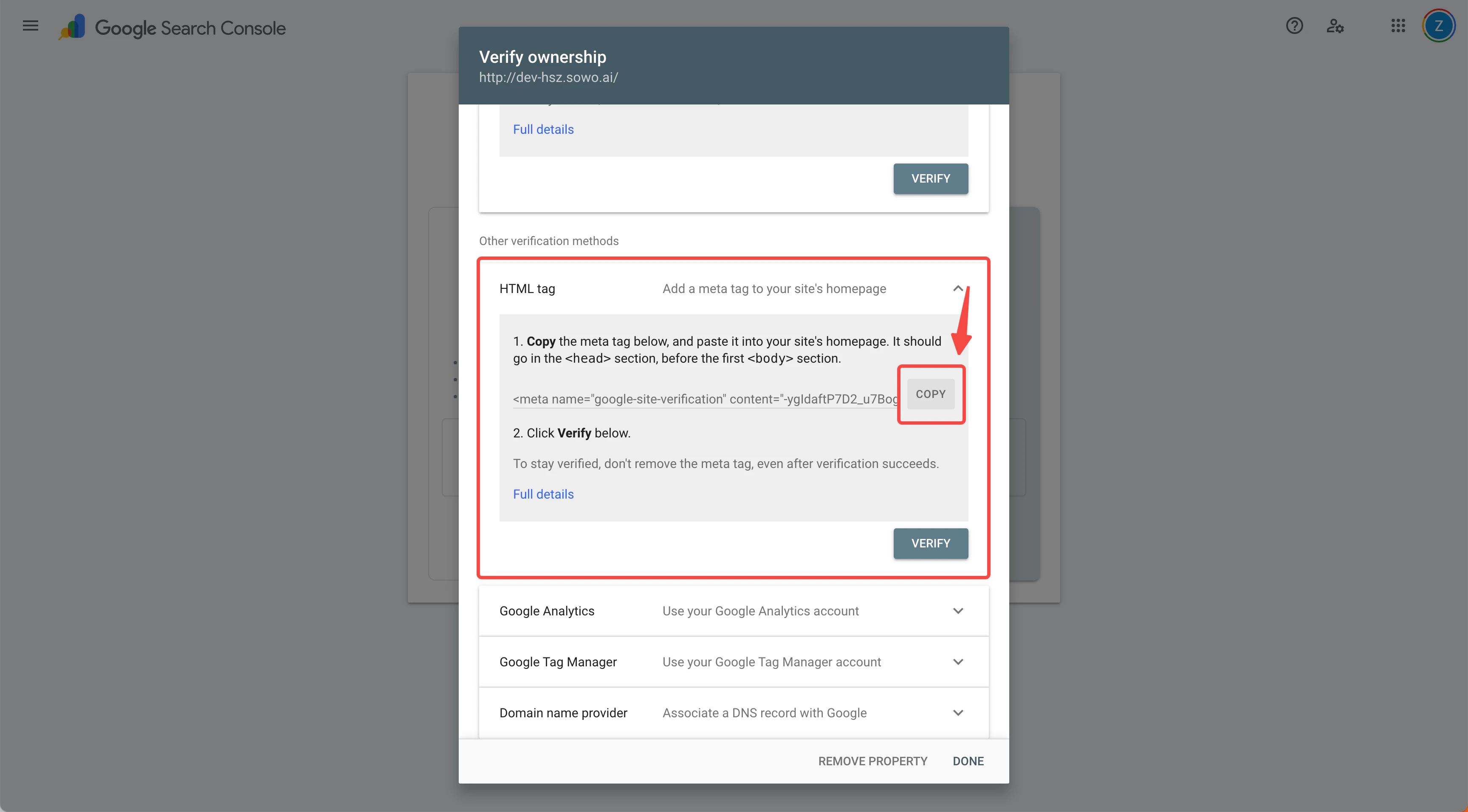 - Select the HTML Meta Tag verification option