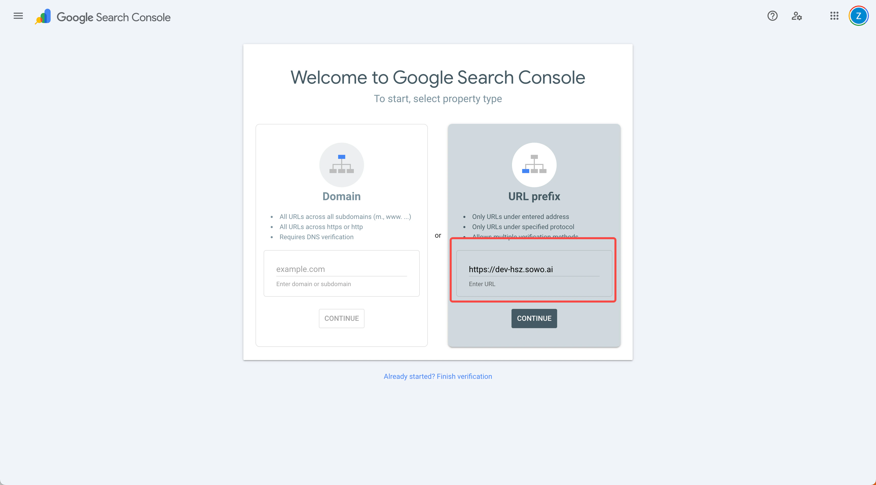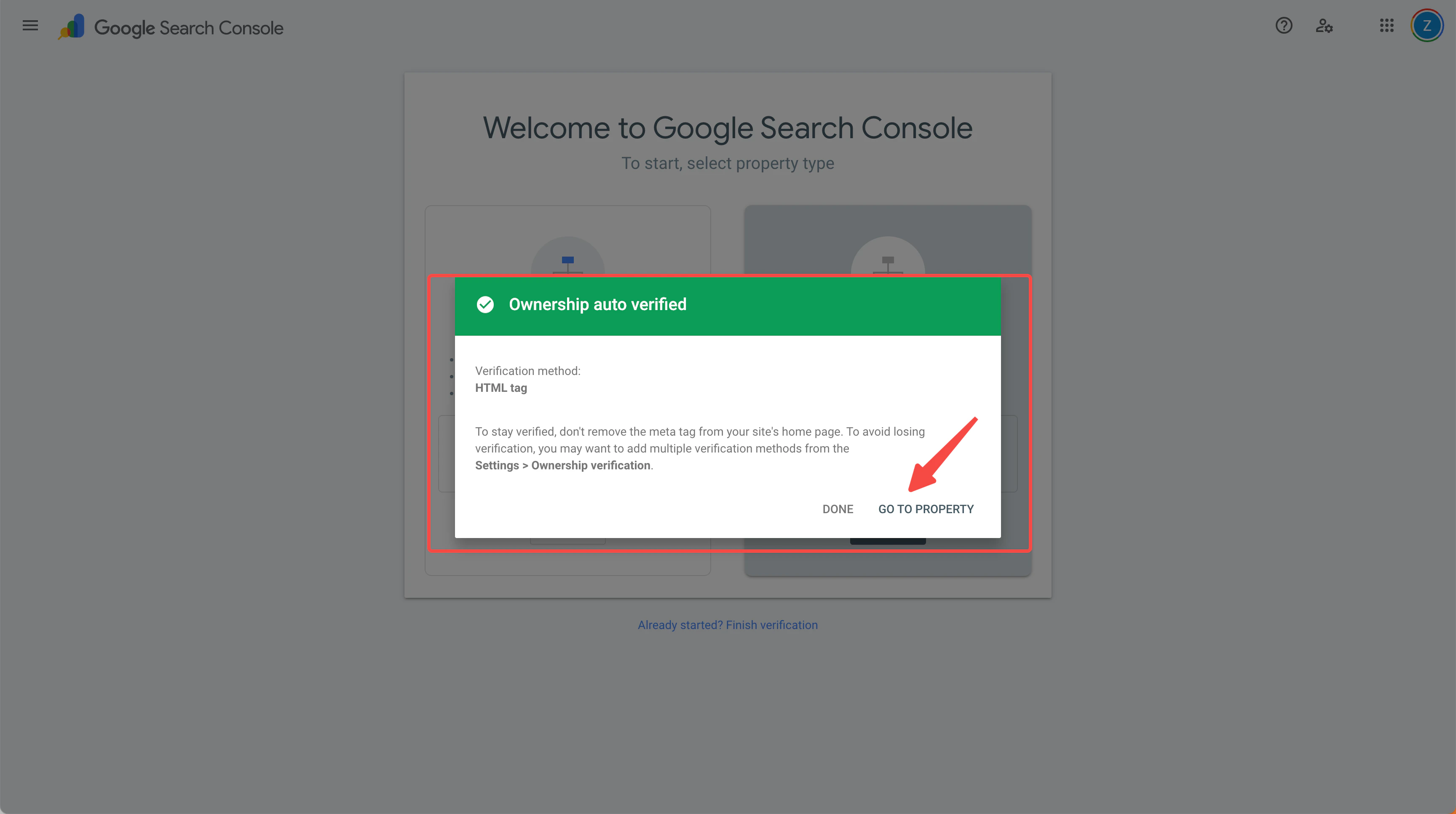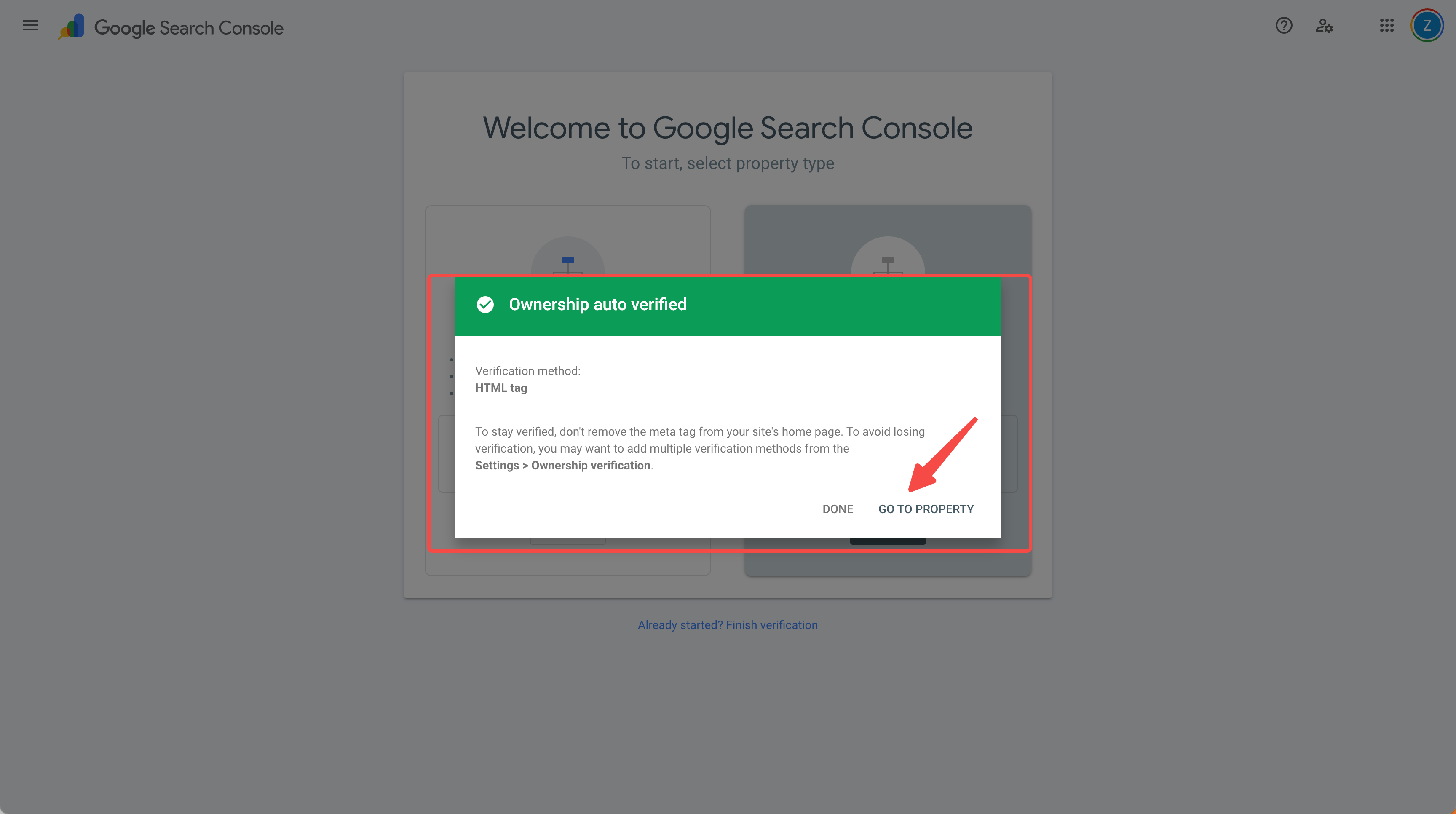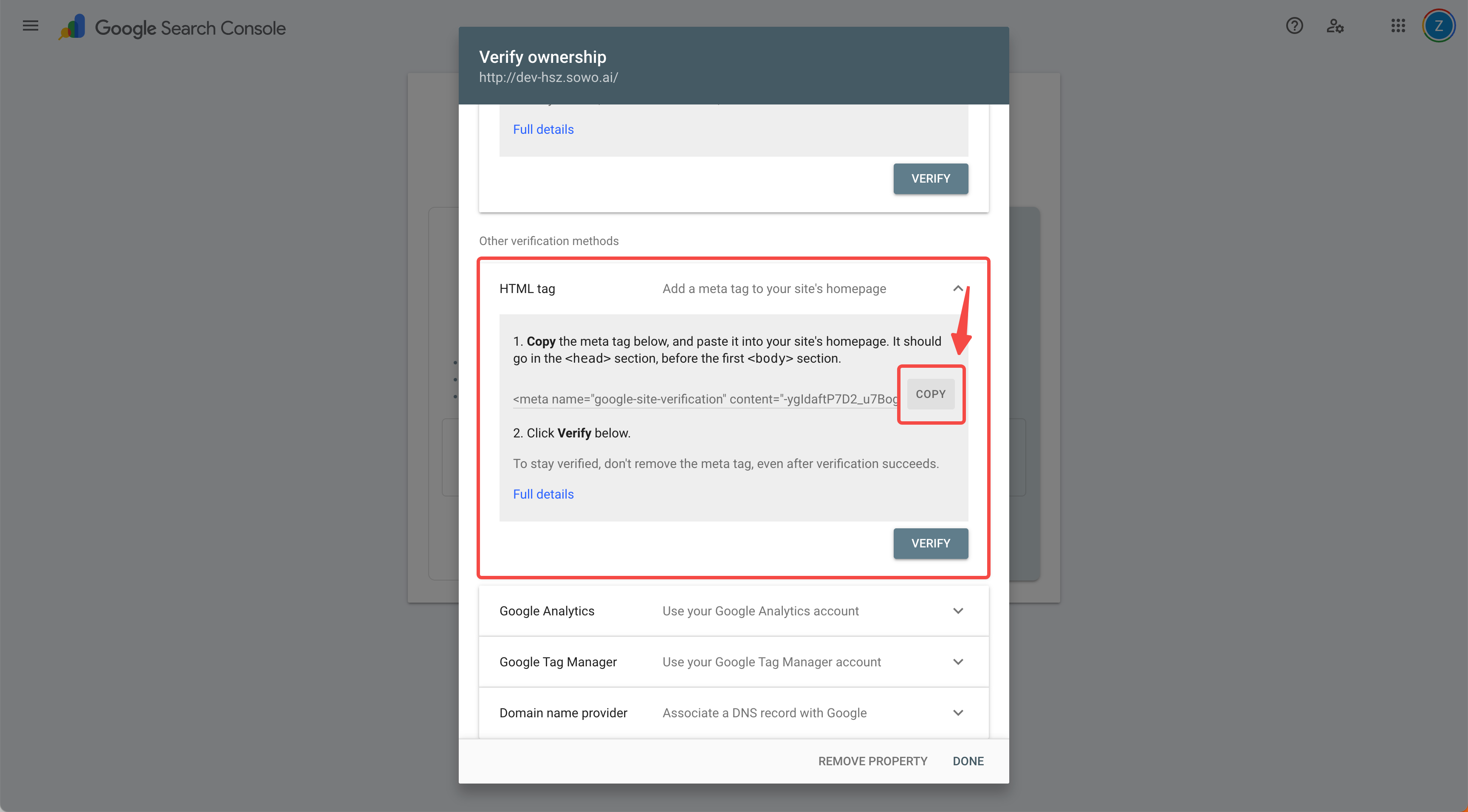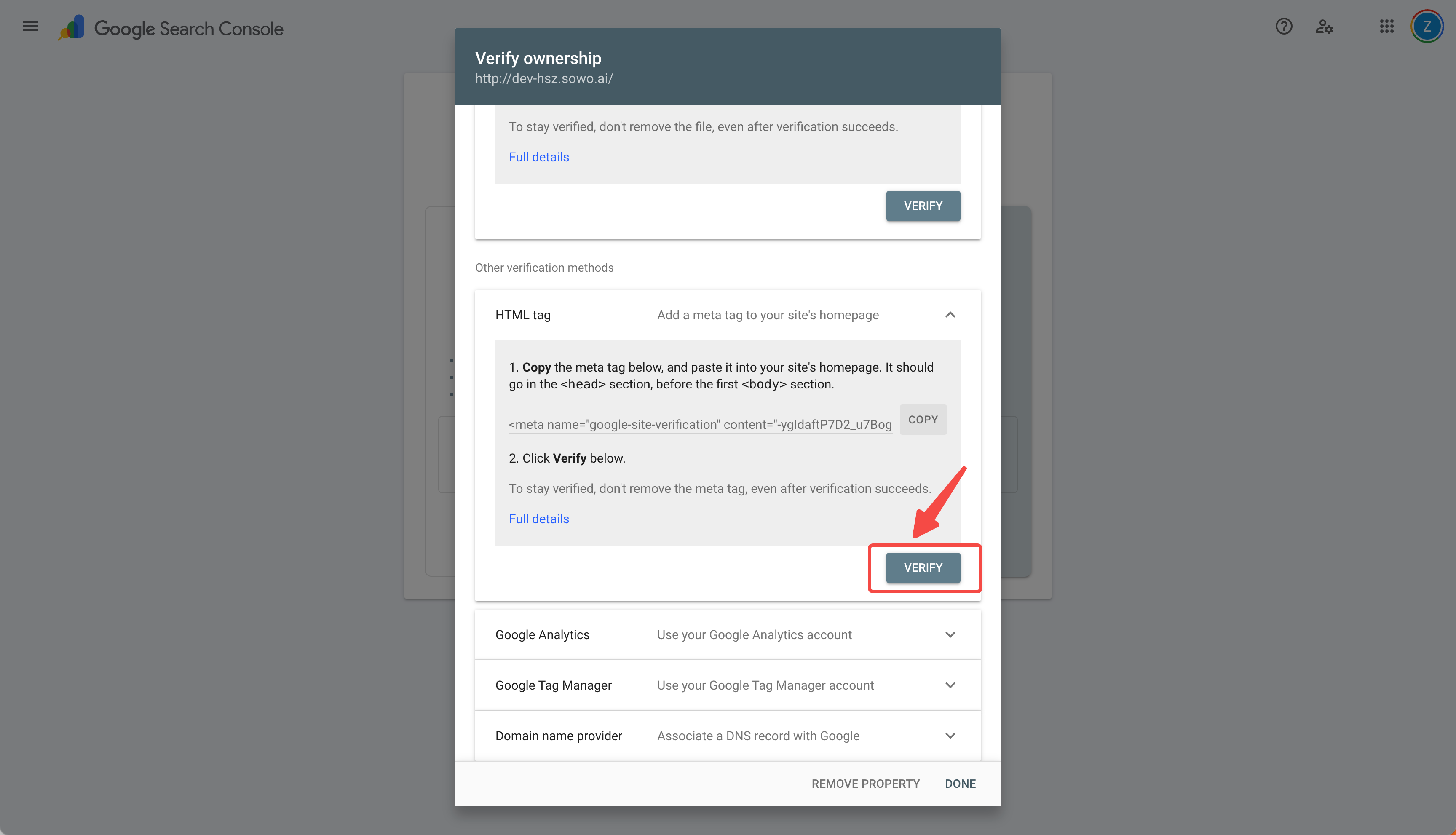 - Return to Google Search Console to complete the verification