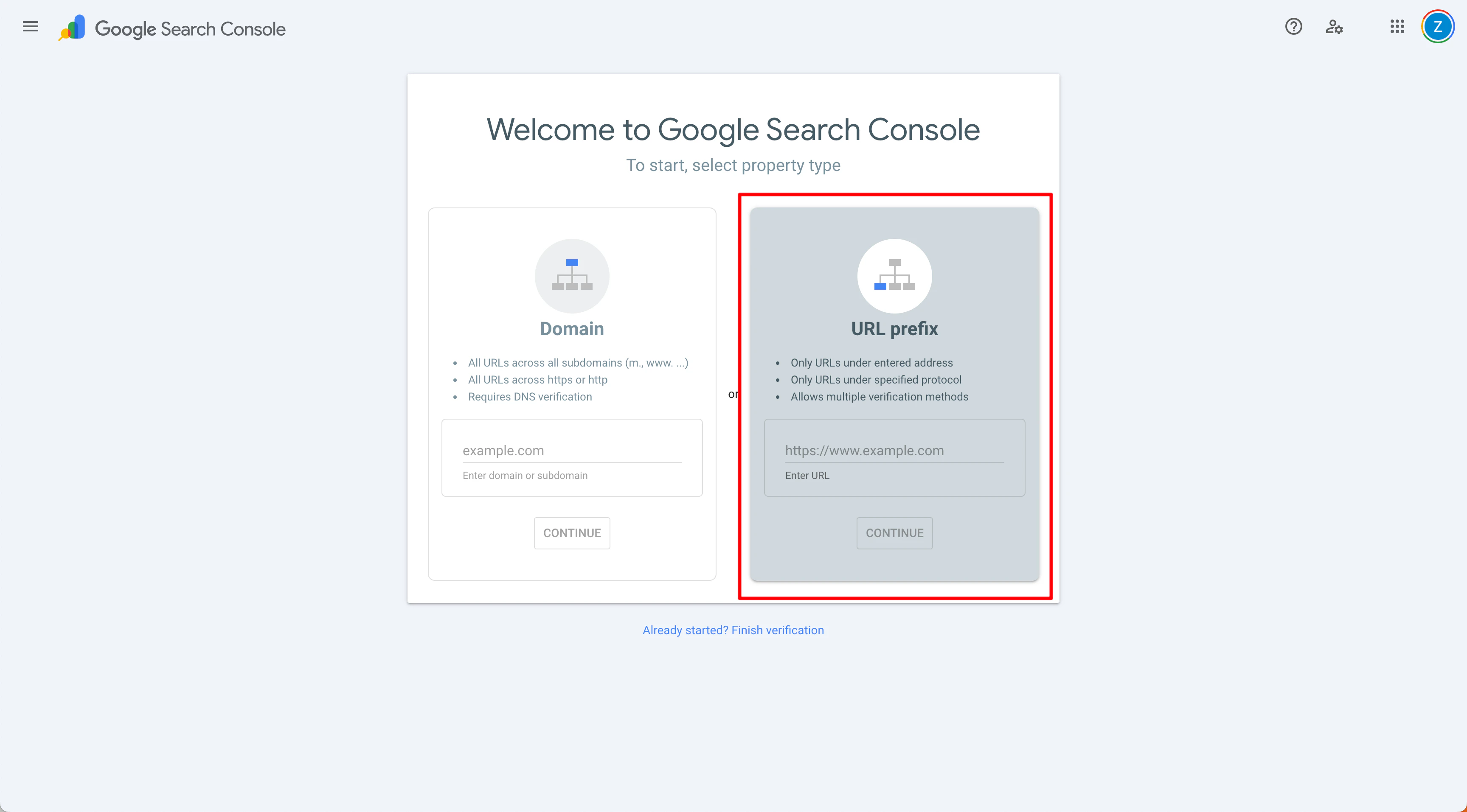 URL Prefix is a verification method that allows you to verify all pages under a specific URL prefix. For example, if you verify