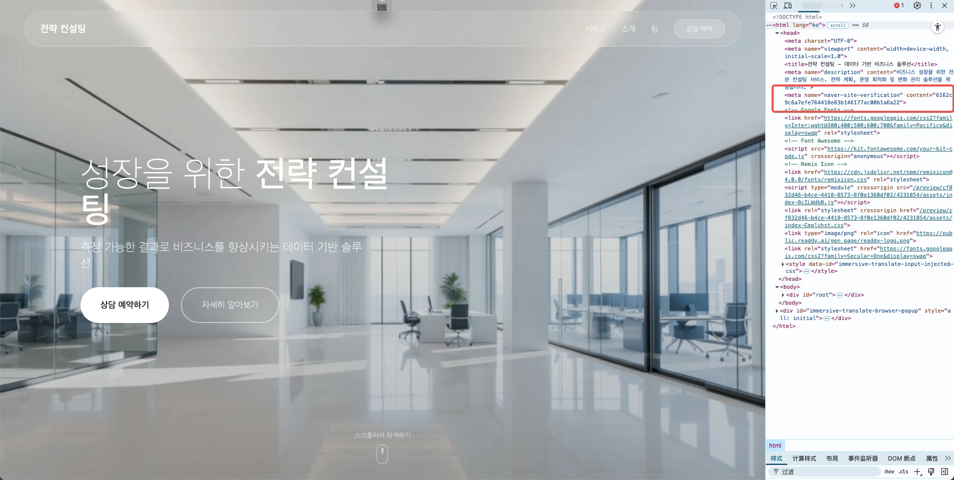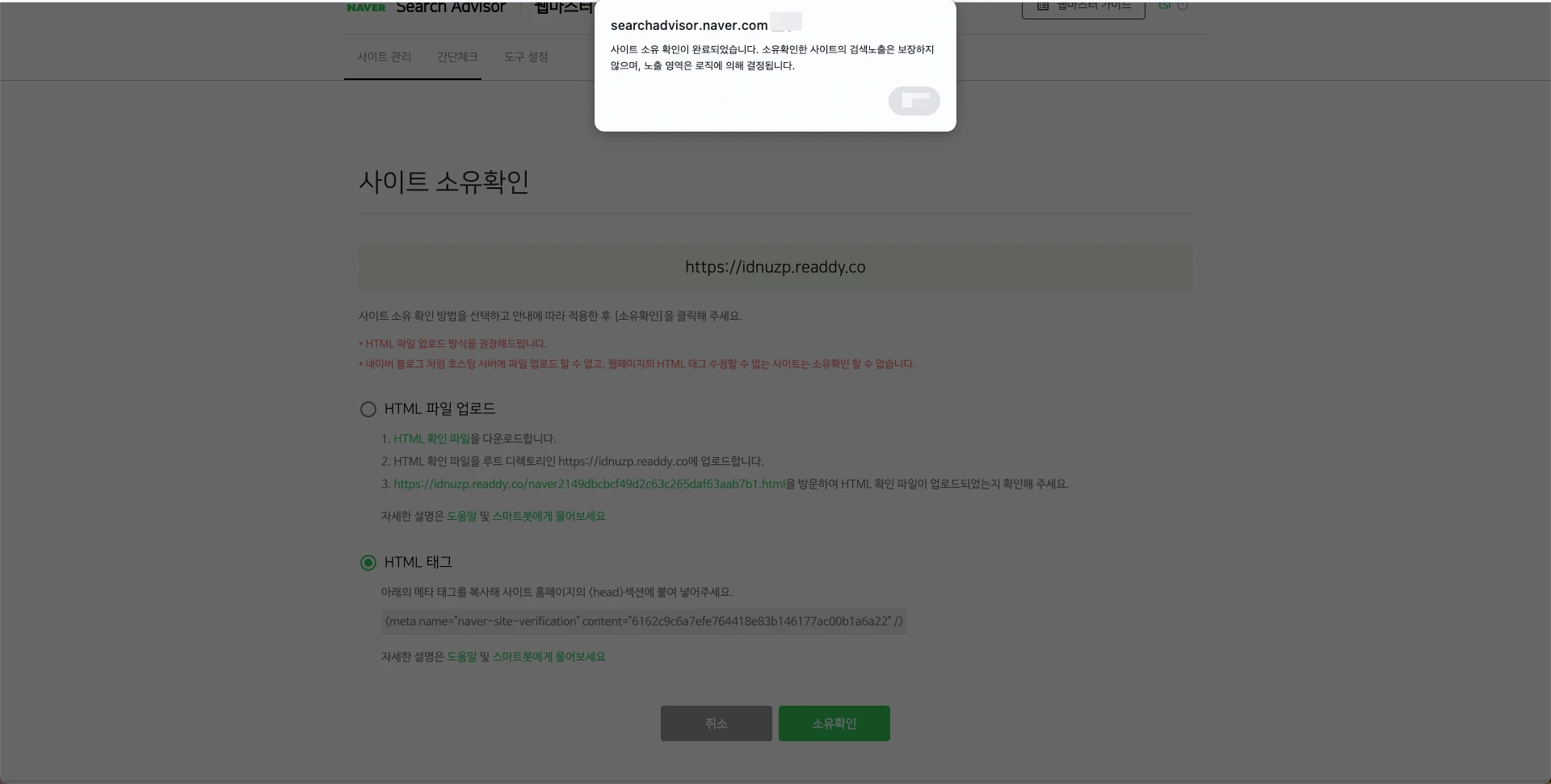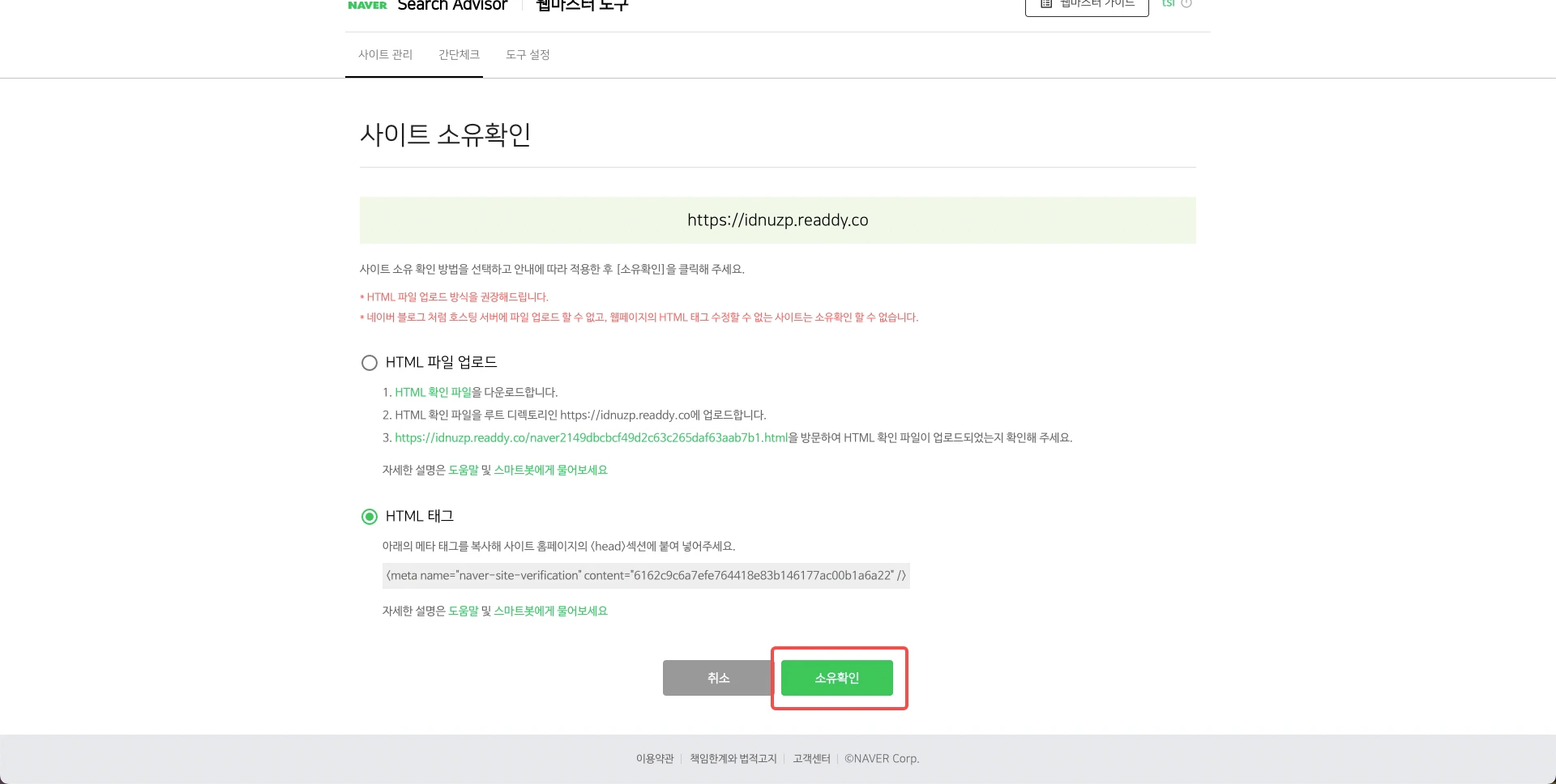 - Click “소유확인” (“Verify ownership”) to complete verification