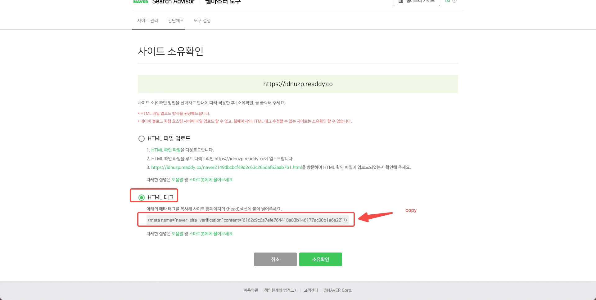 - Copy the meta tag code provided by Naver