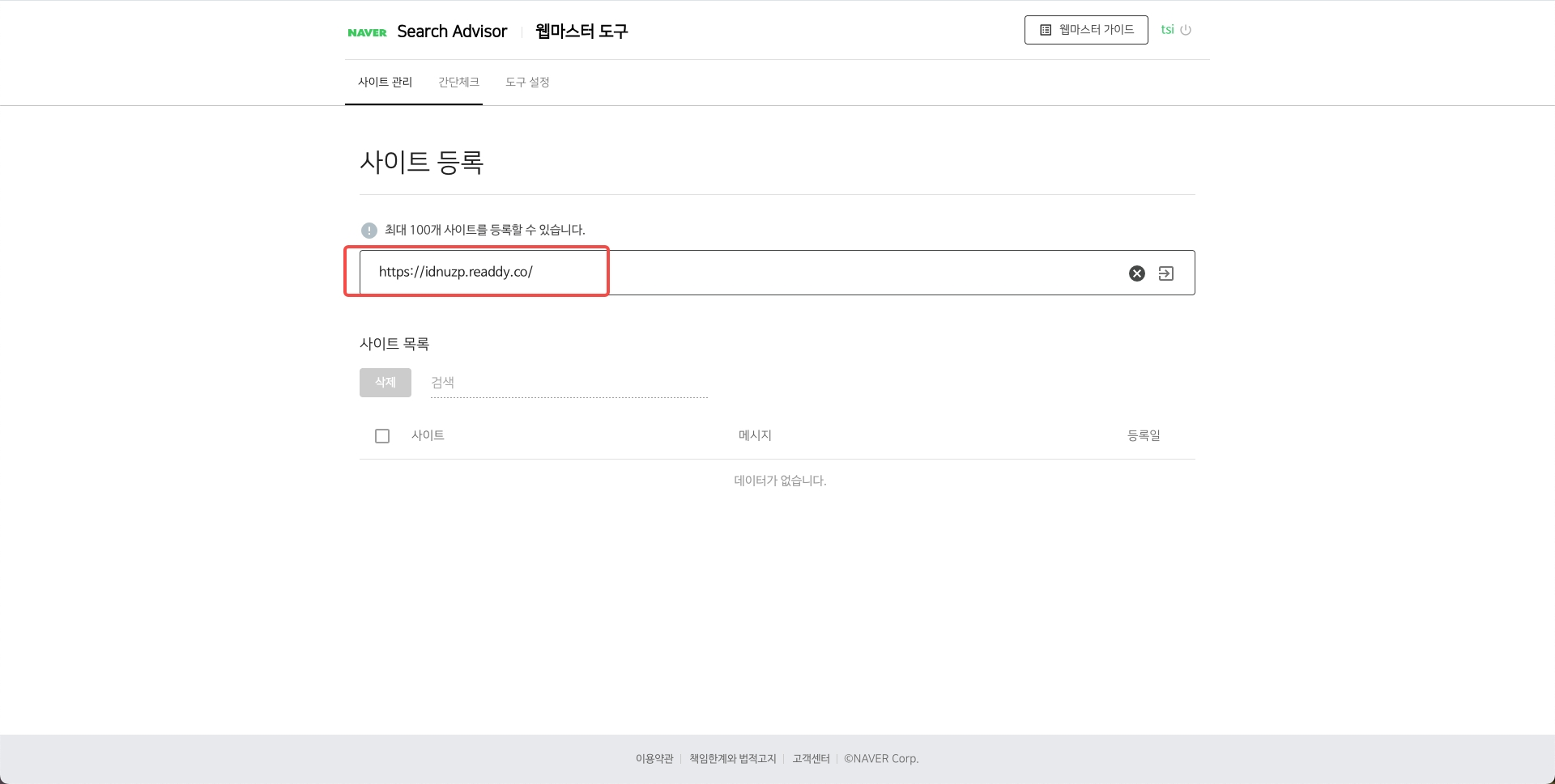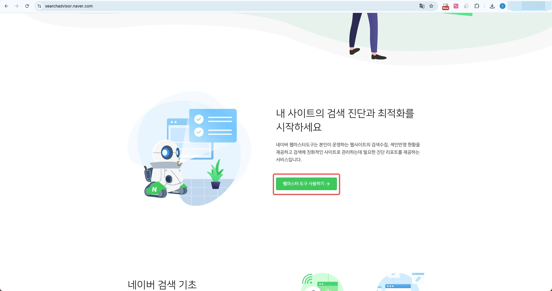 Access Naver Search Advisor and log in with your Naver account. After logging in, click “웹마스터 도구 사용하기” (“Use Webmaster Tools”).