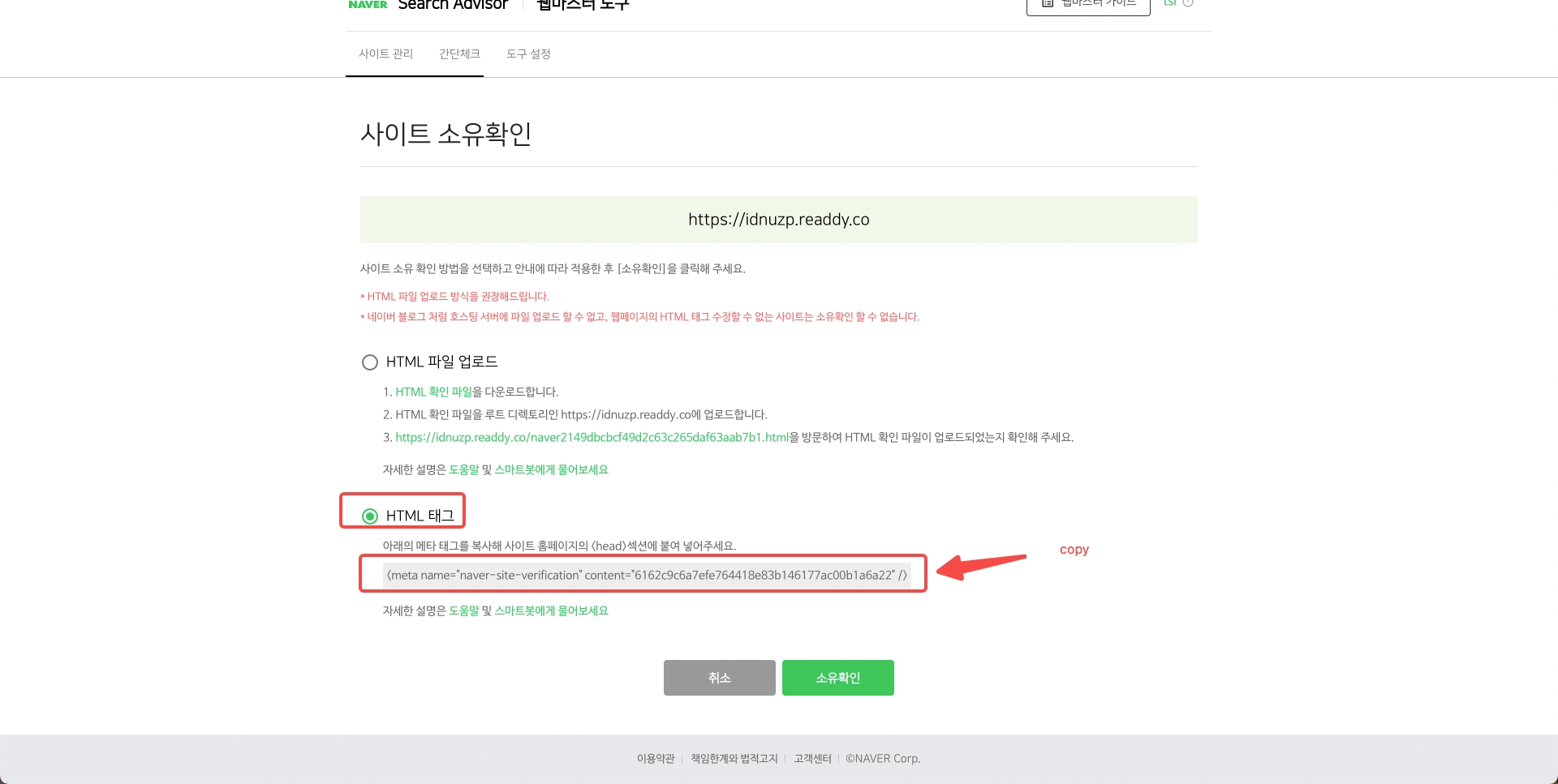 Naver provides multiple verification methods. We recommend choosing the “HTML Meta Tag” method for verification.