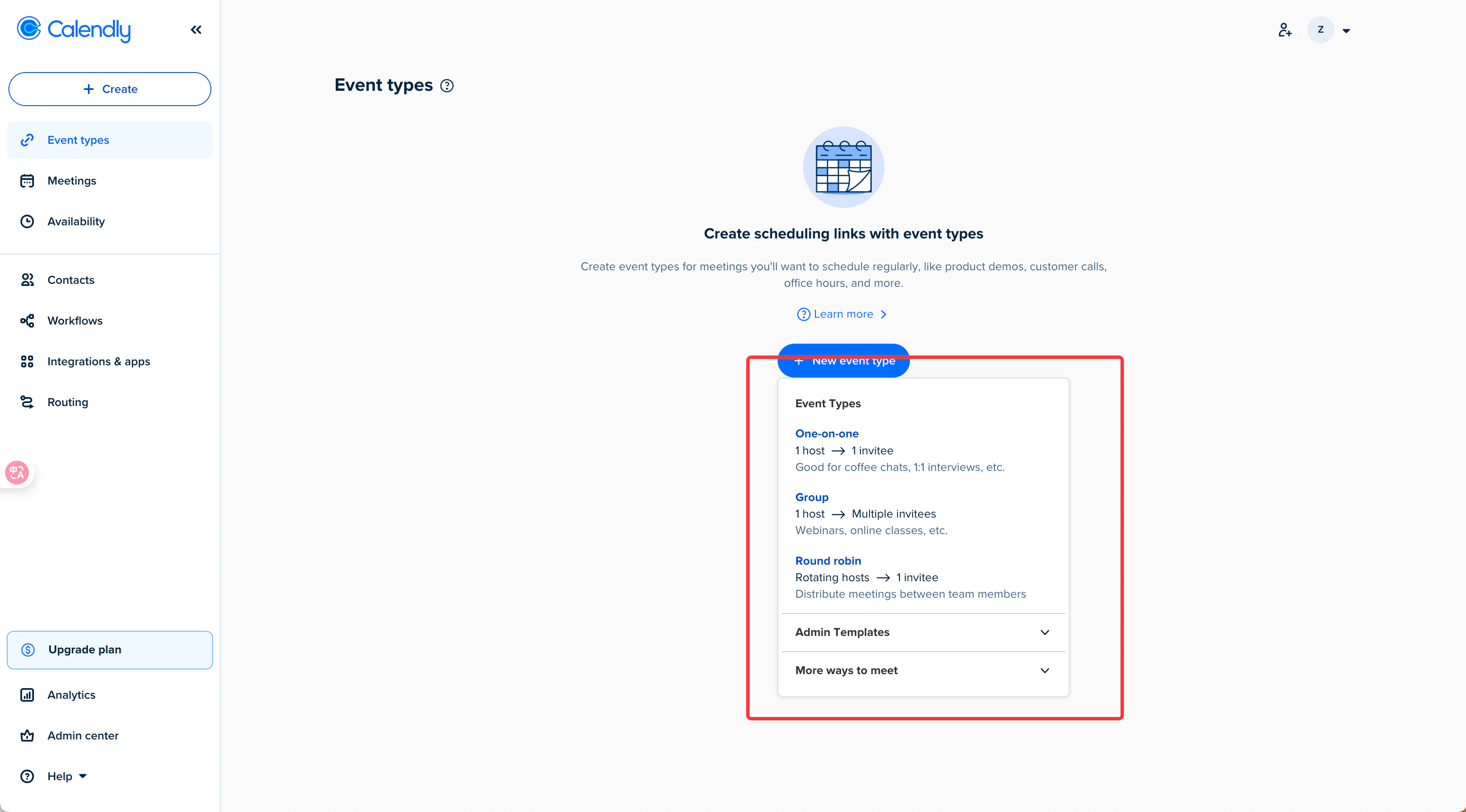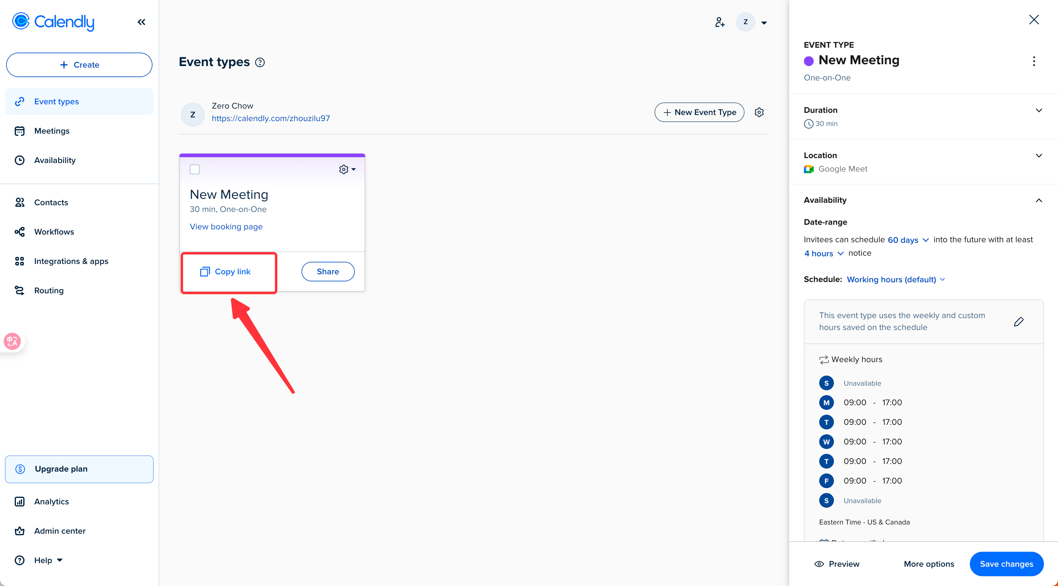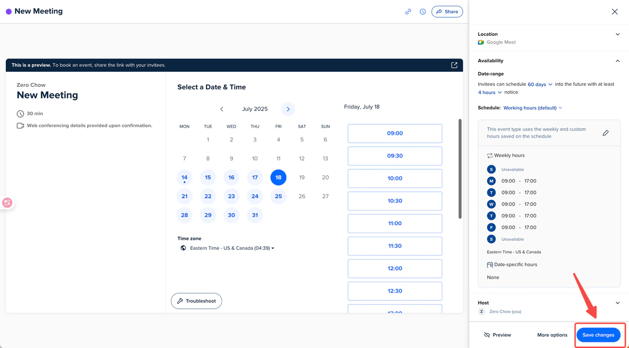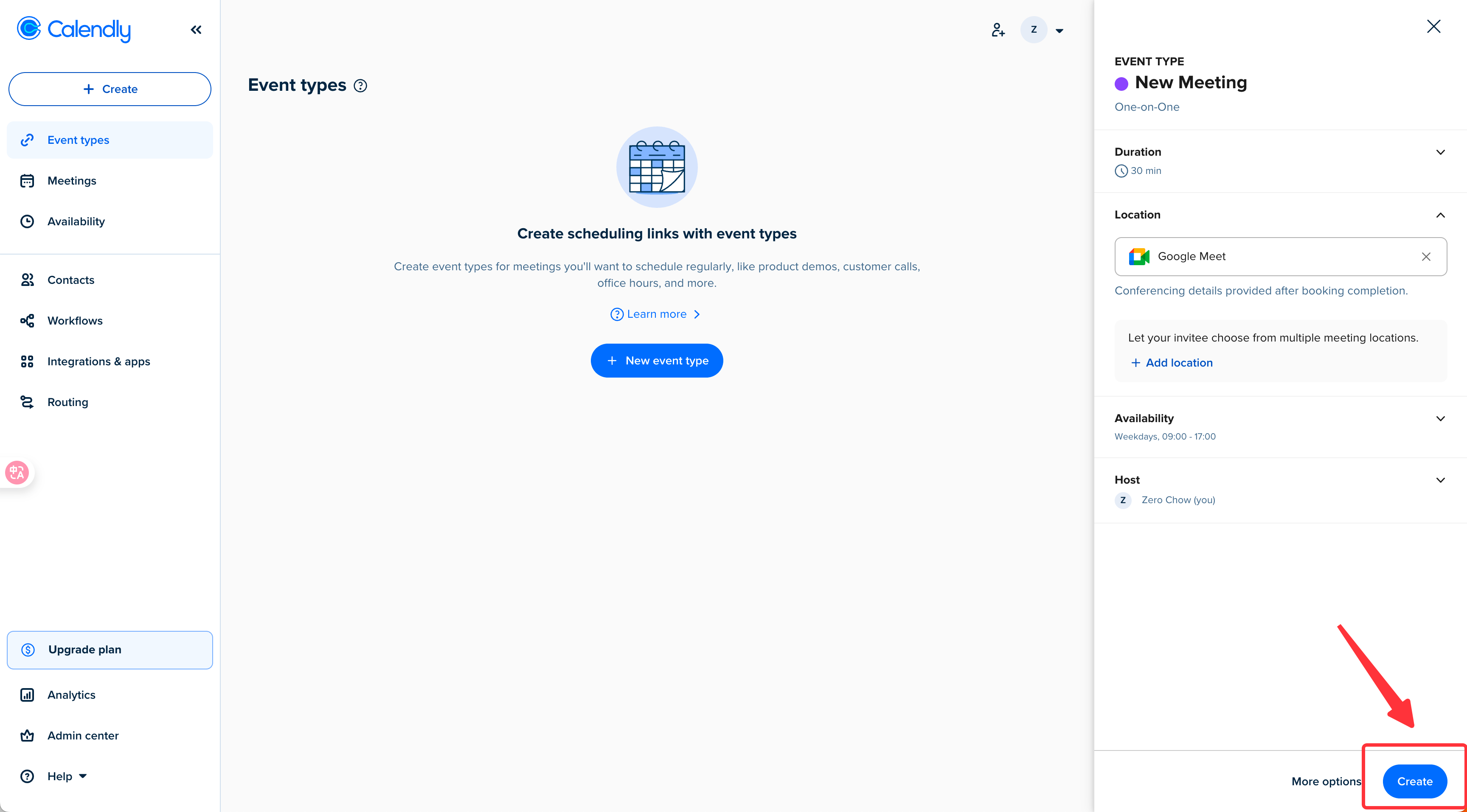 Choose an event type that fits your needs (e.g., select “One-on-One”) and complete the setup, then save your changes.