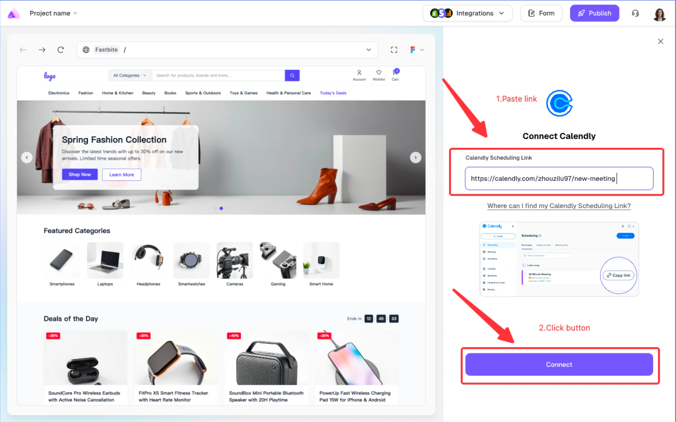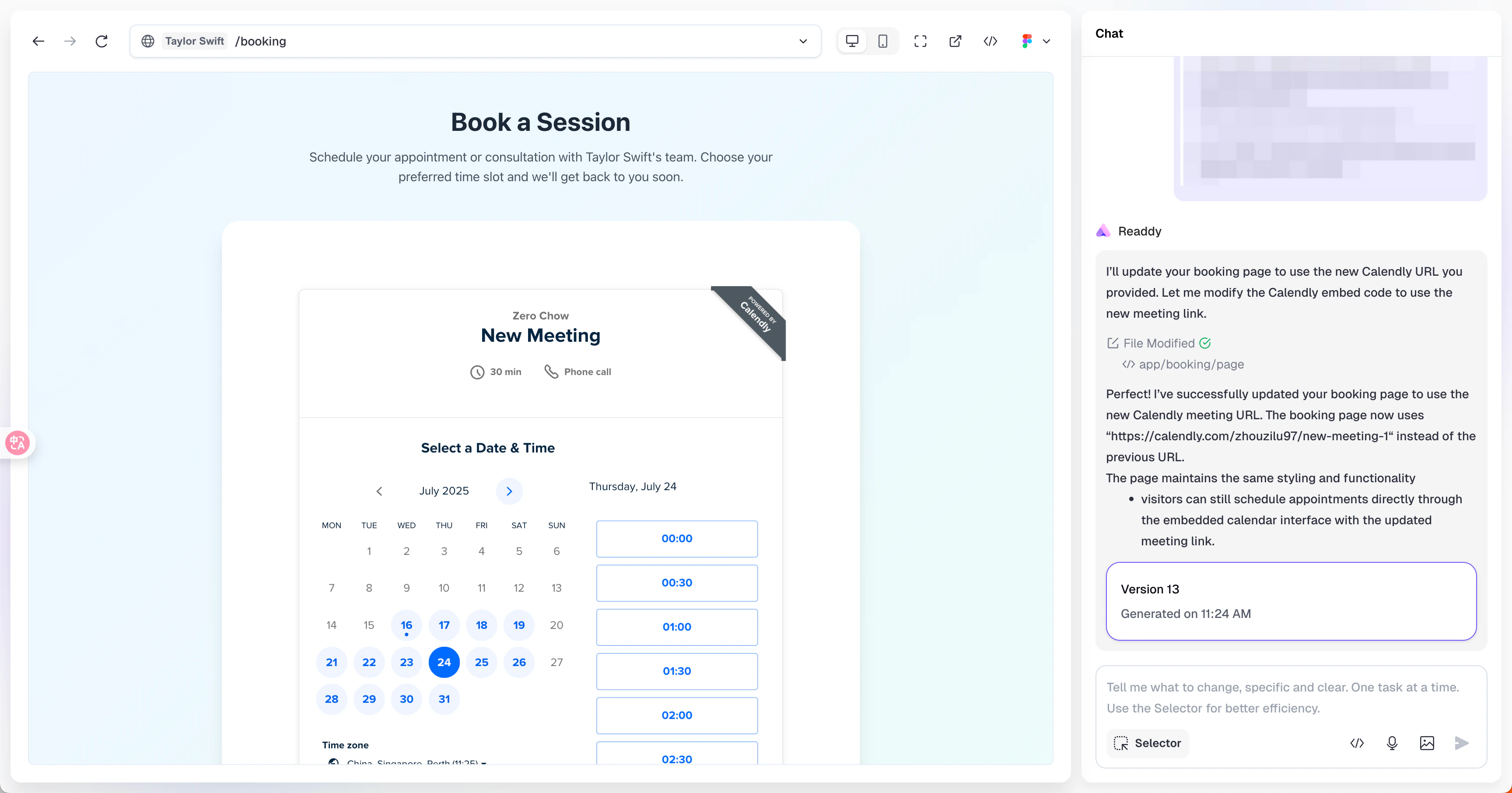 After setup, a card for your new event will be generated. Click Copy Link to copy the event URL. Go back to Readdy, paste the link into the input field, and click the button to let AI generate a new version that includes the Calendly event.