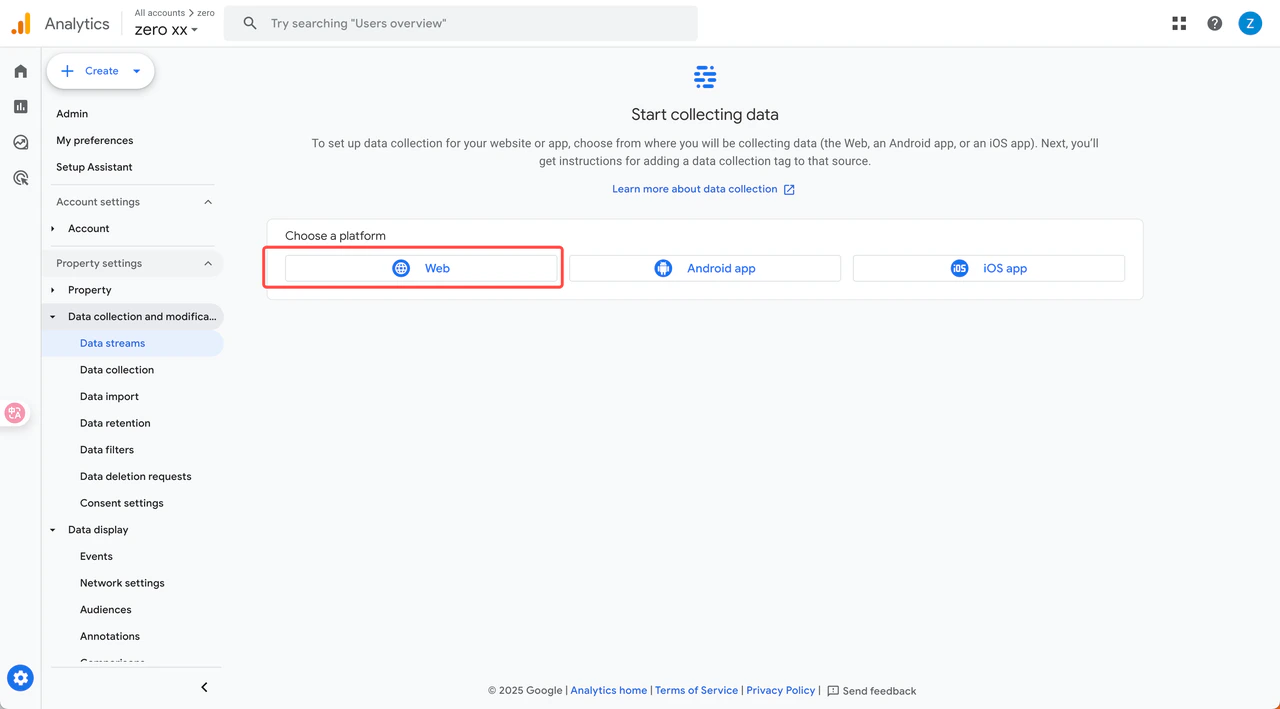 If no existing Data Stream is available, click “Web” to create one. Follow the steps from Step 4 to Step 6 in the “New to GA” section.