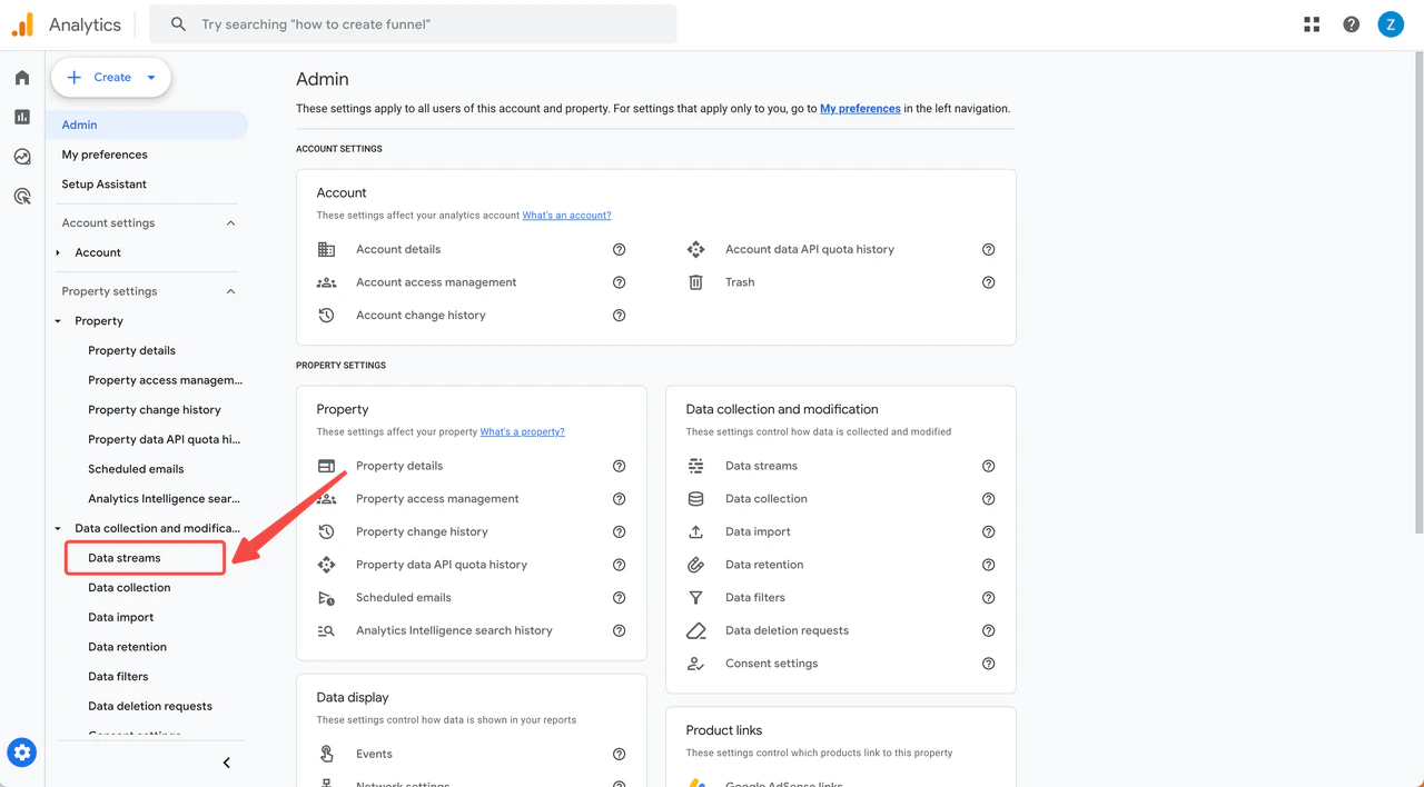 Under Property Settings > Data collection and modification, select “Data Streams”.