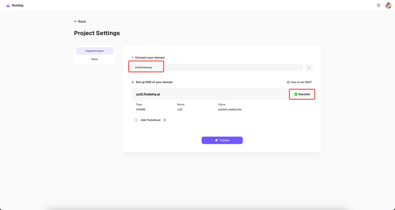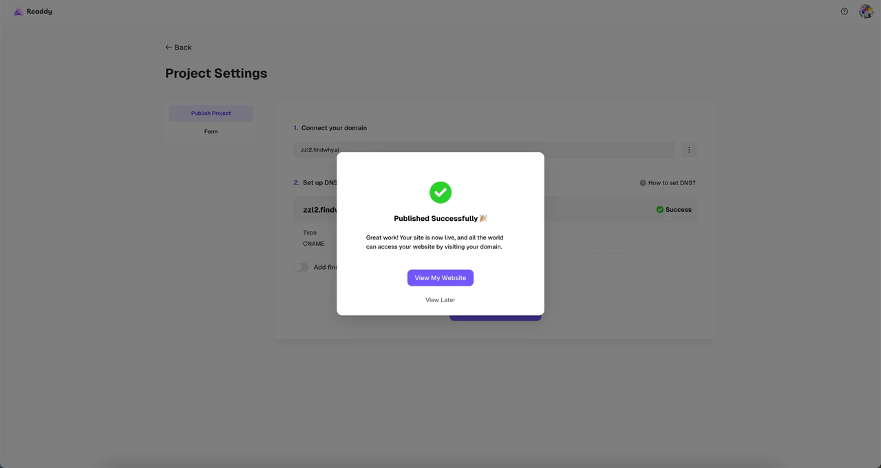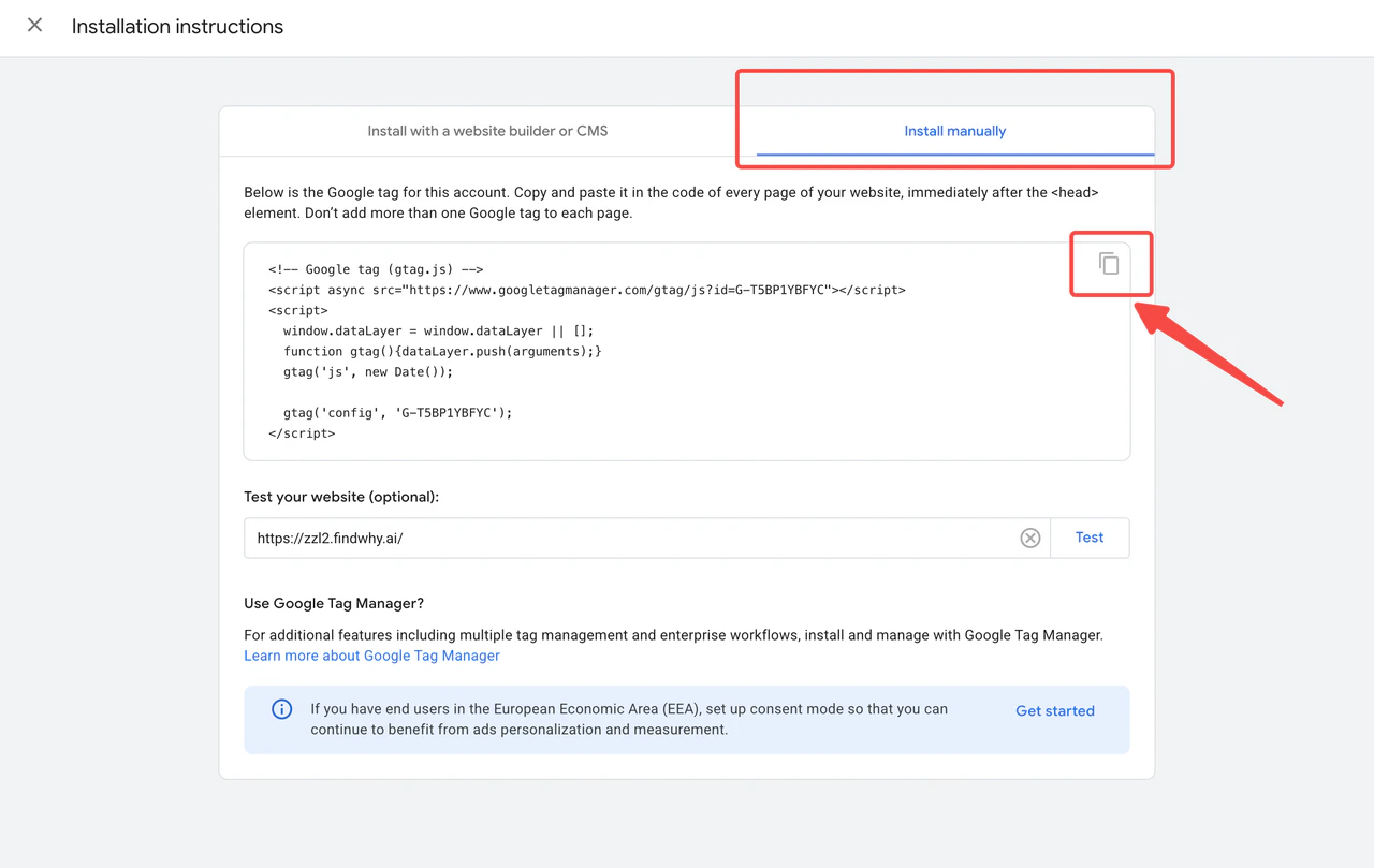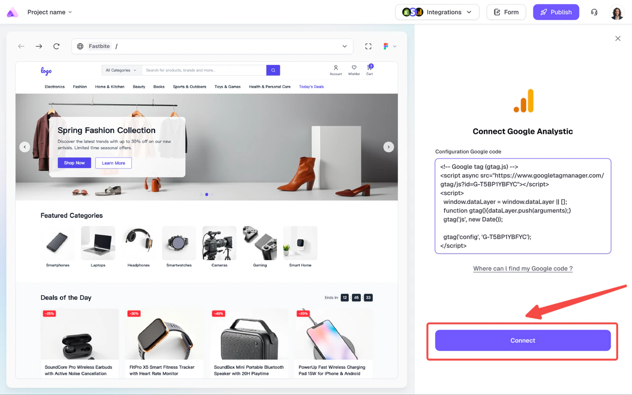 A popup will appear with your Google tag. Copy the code and paste it into the input field in Readdy. Click “Connect” to generate a new version. Don’t forget to re-publish your domain afterwards.