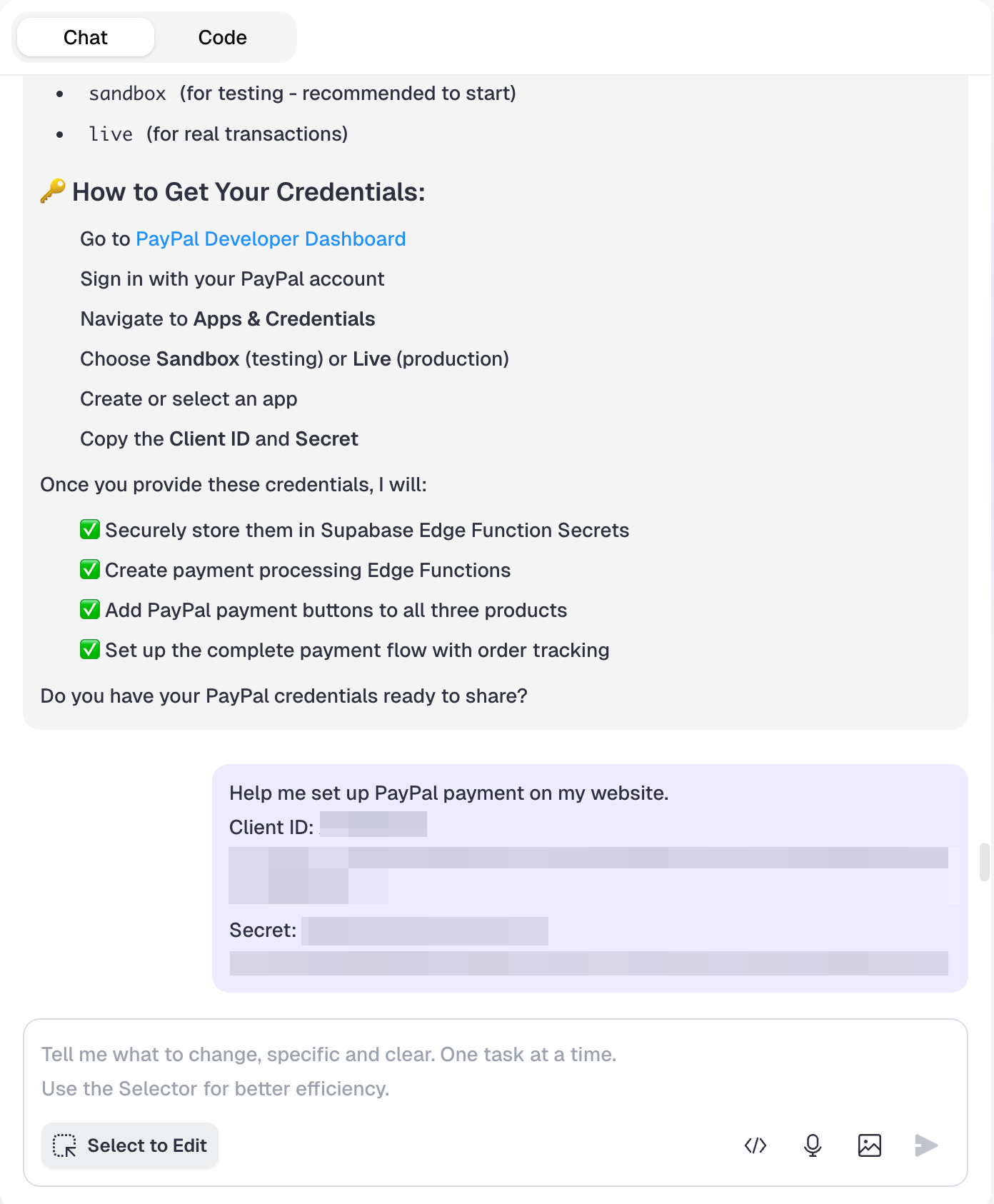 After AI configures the integration, you need to manually add your PayPal credentials to Supabase:- Log in to Supabase Dashboard