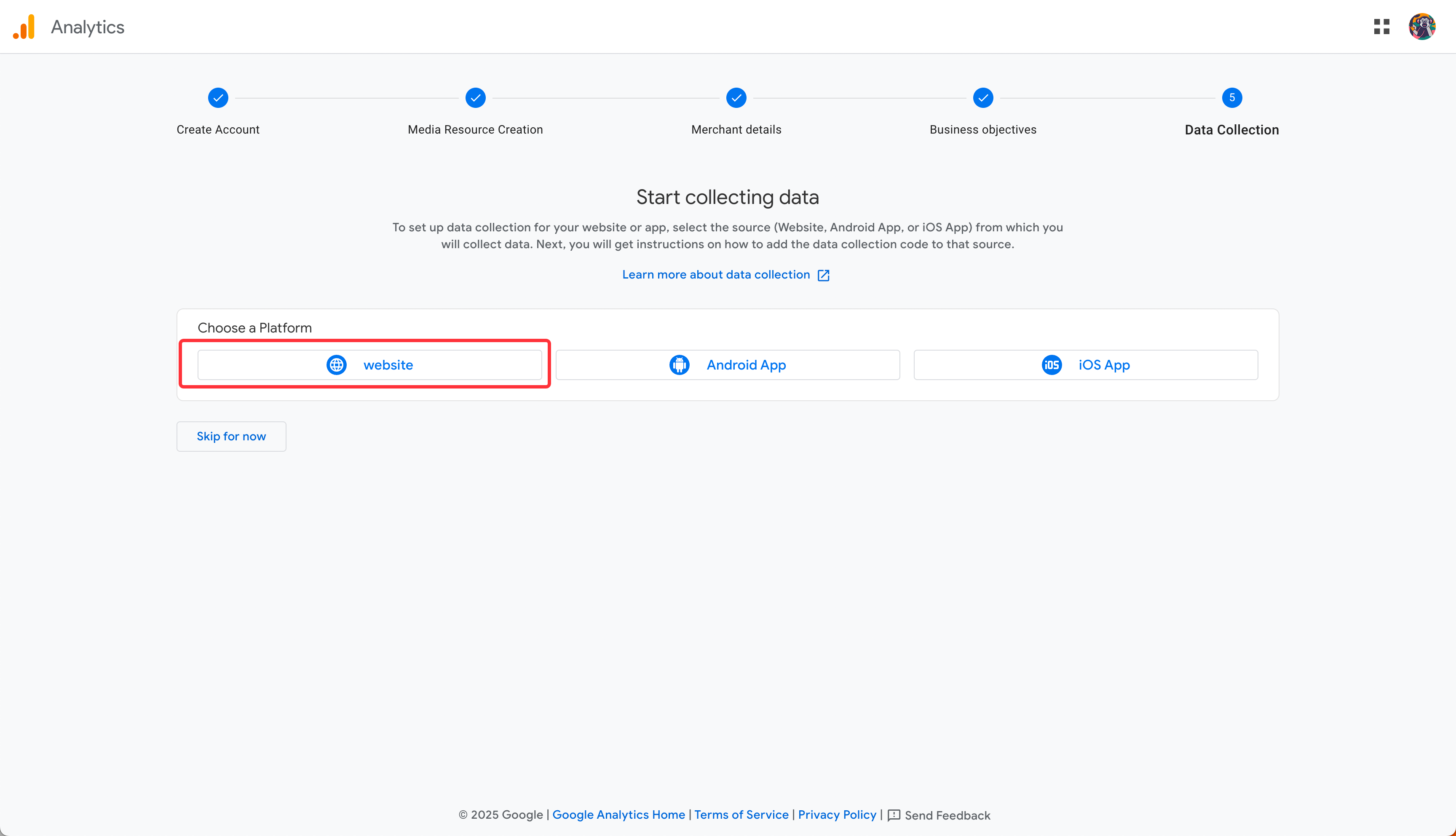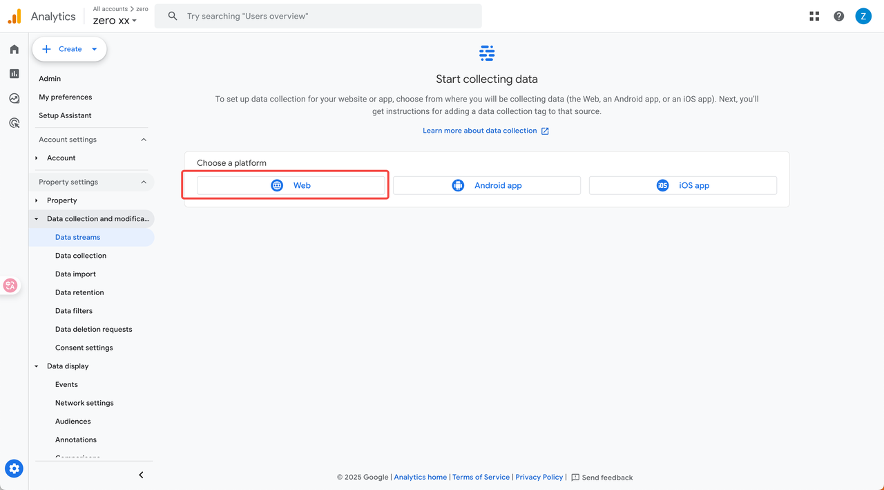 If no existing Data Stream is available, click “Web” to create one. Follow the steps from Step 4 to Step 6 in the “New to GA” section.