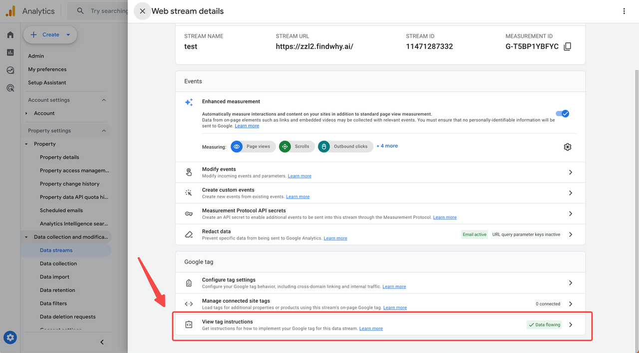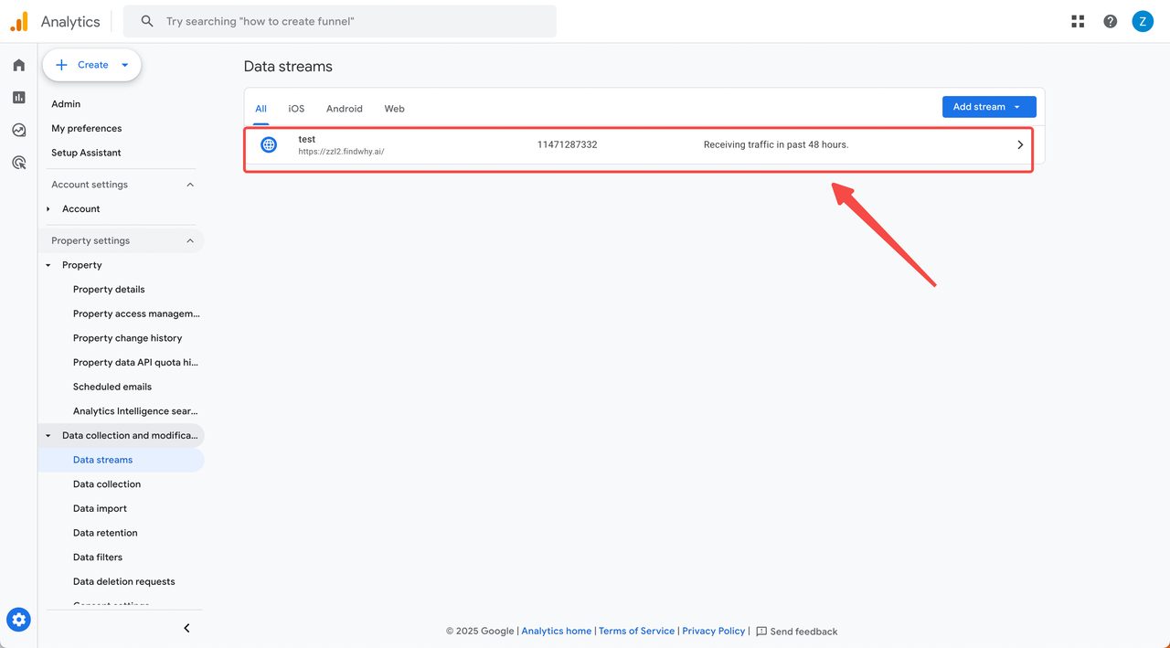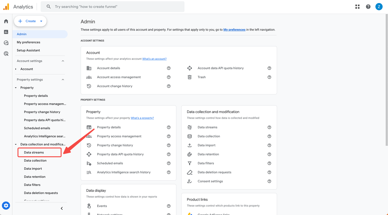 Under Property Settings > Data collection and modification, select “Data Streams”.