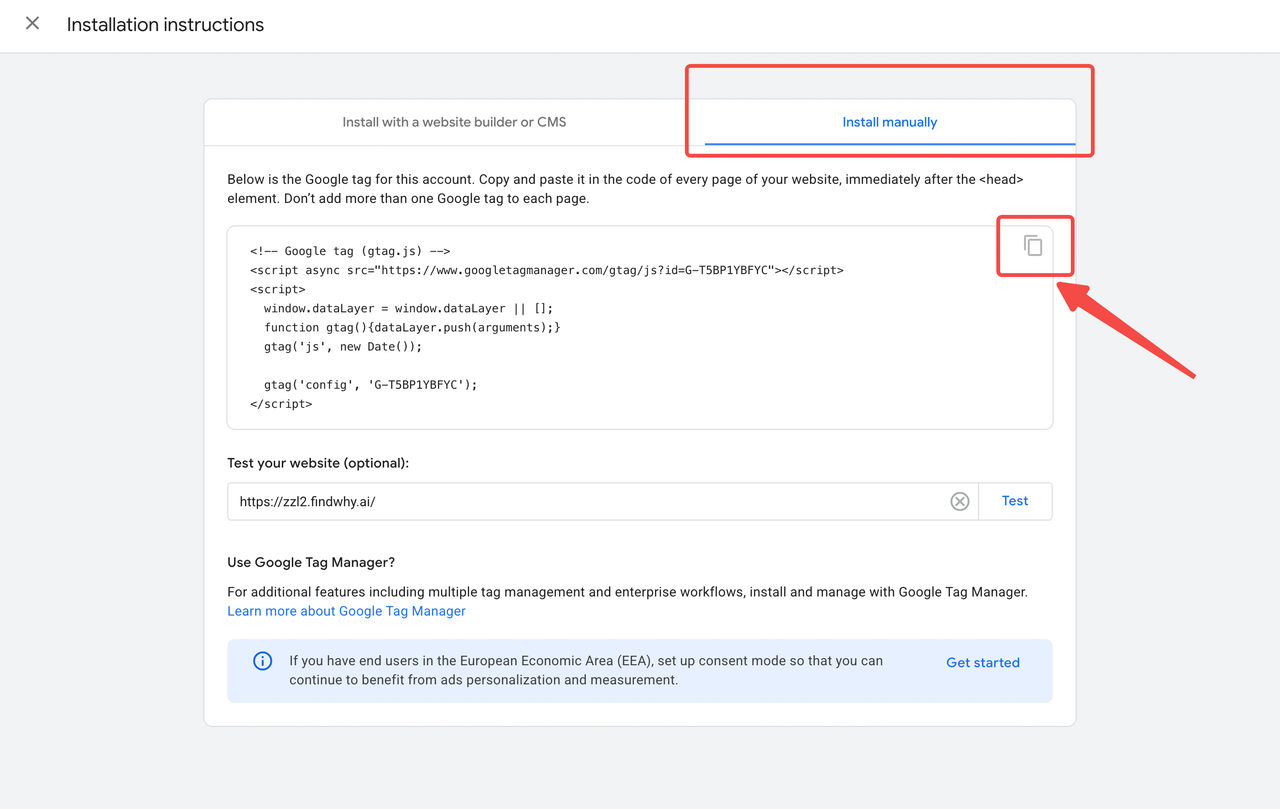 A popup will appear with your Google tag. Copy the code and paste it into the input field in Readdy. Click “Connect” to generate a new version. Don’t forget to re-publish your domain afterwards.