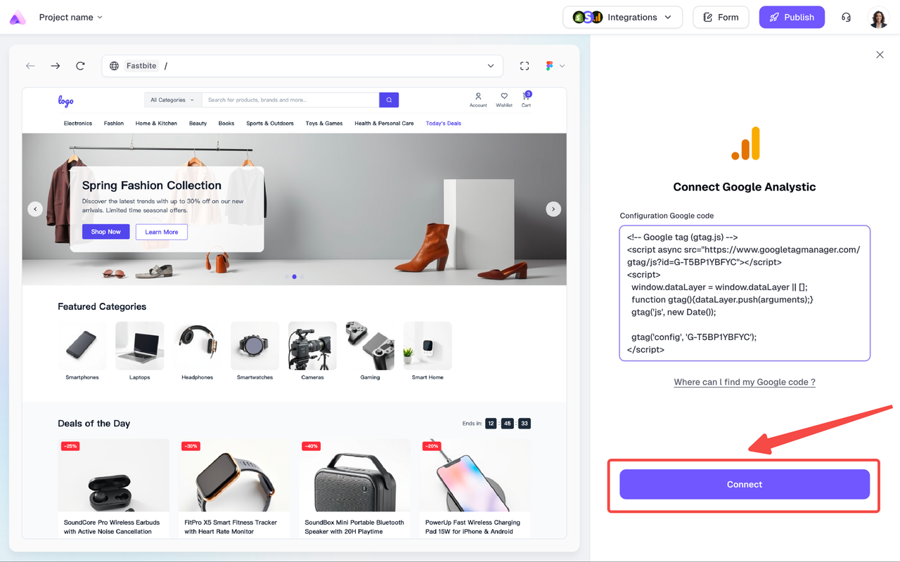 Go back to Readdy, paste the code into the input field, and click “Connect”. A new version connected to GA will be created.