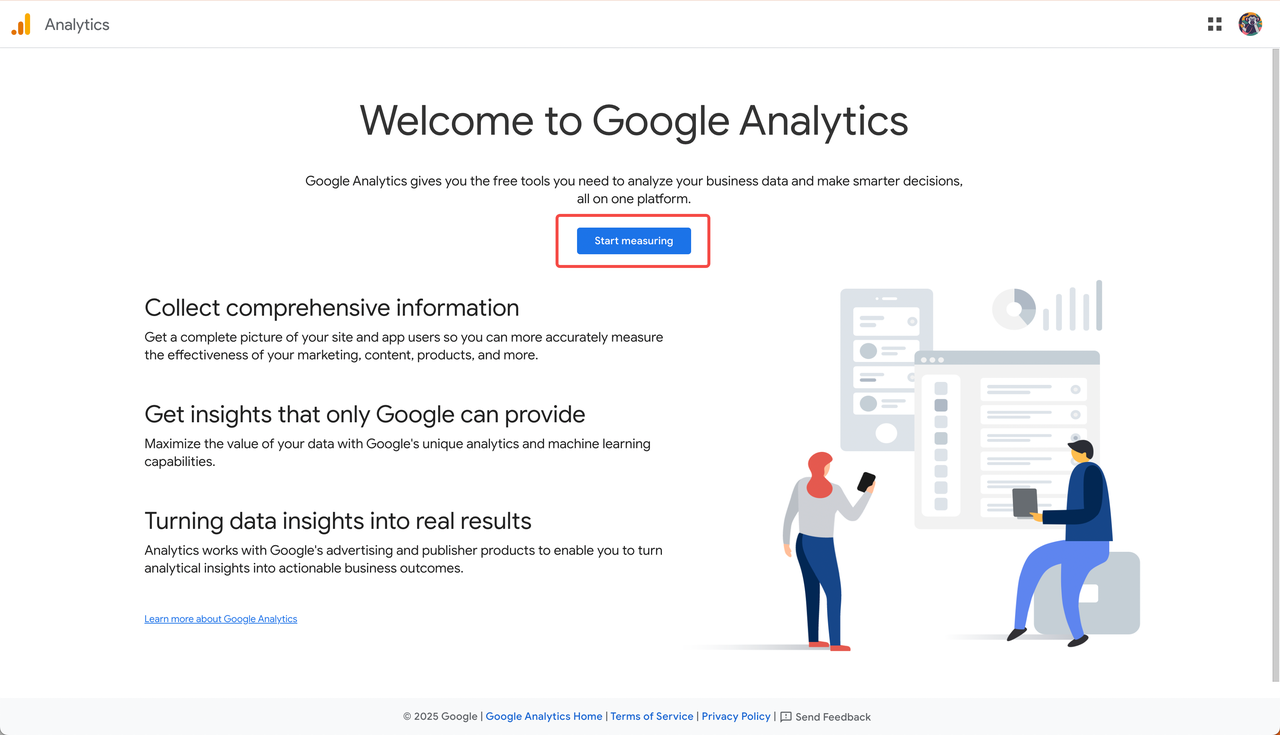 Go to the Google Analytics platform and click “Start measuring” to begin setup.
