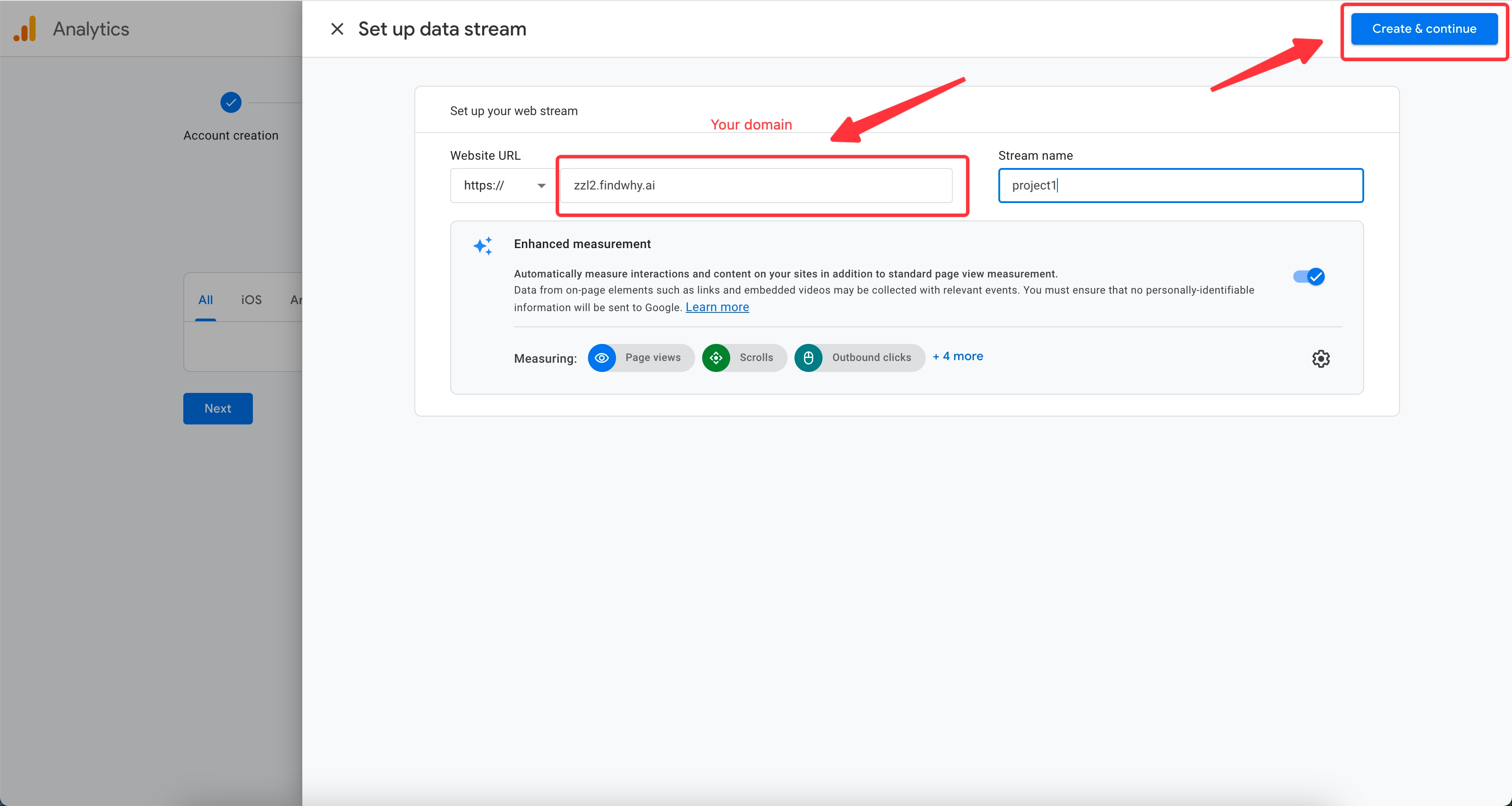Enter your published domain and give your Data Stream a name. Then click “Create and Continue”.